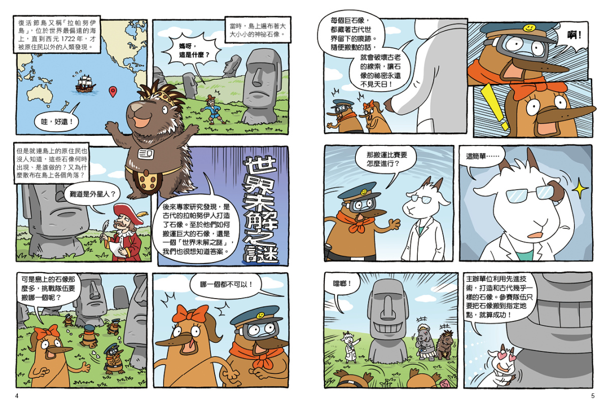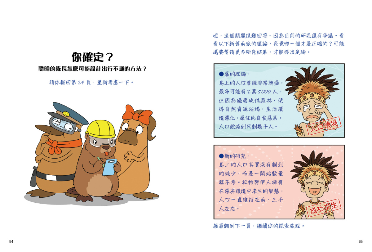 而「世界未解之謎」系列,更是一場挑戰素養的大冒險書。不僅維持輕鬆的漫畫,更加上在書頁間跳動的遊戲挑戰書。以這次的「搬運石像」來說,就需要揉合數學和物理能力;而復活島居民的興衰,又涉及複雜的自然生態崩壞對人類社會運作的惡性循環。這些都不是單一科目可以解決的問題,也不是能輕鬆解構的複雜因素。