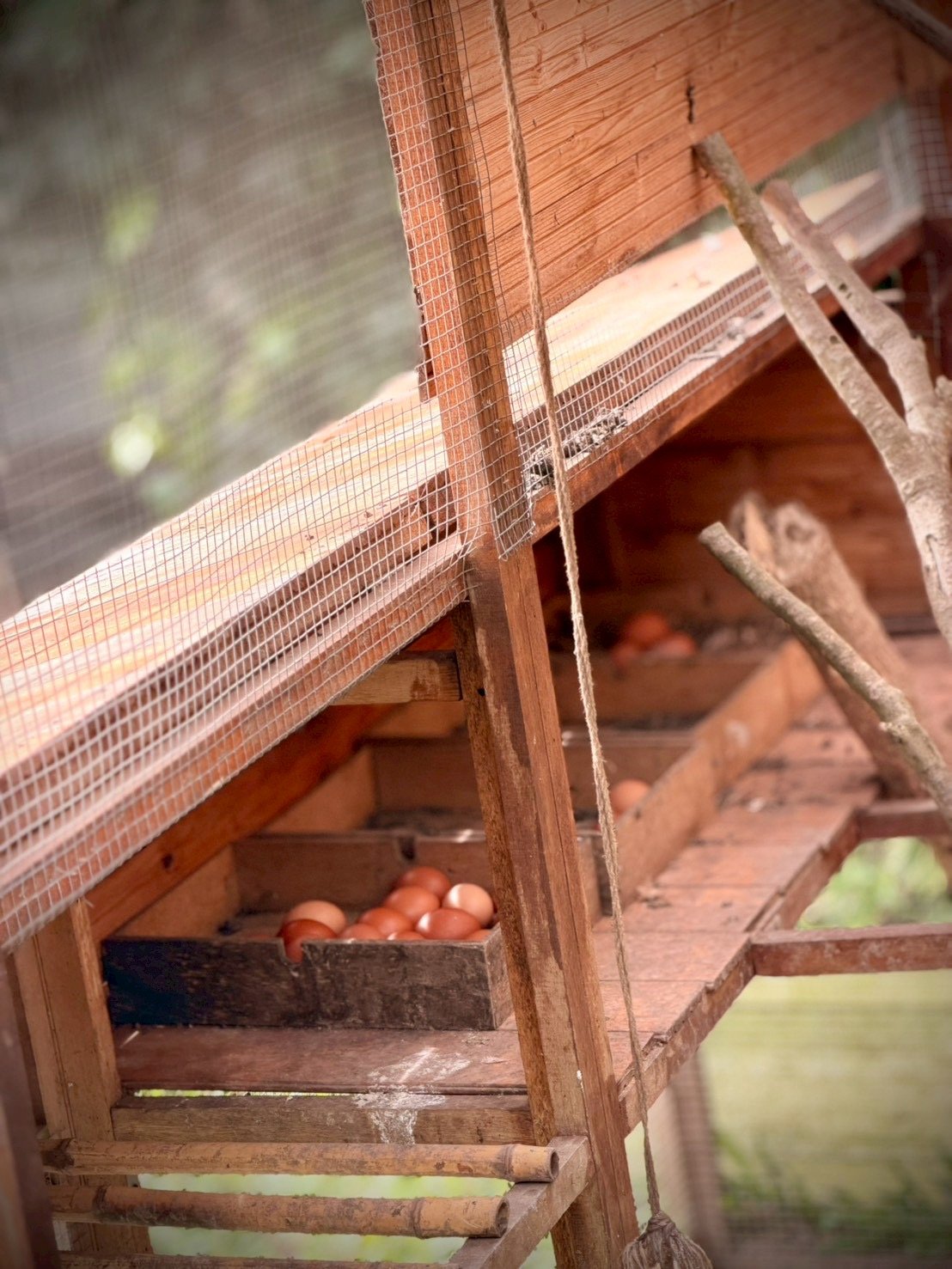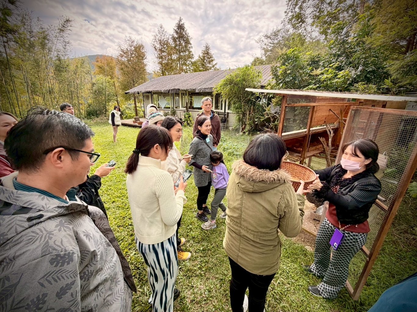 因為當天我正在進行八關齋戒,能吃飯的時間非常有限(過午不食),所以看著相當「原始」的餐桌,心裡是微微焦慮的。不過沒有時間讓我多想,集思行旅的Kathy便帶領我們前往教室後方的一處雞舍,開始為我們介紹起了養雞空間。