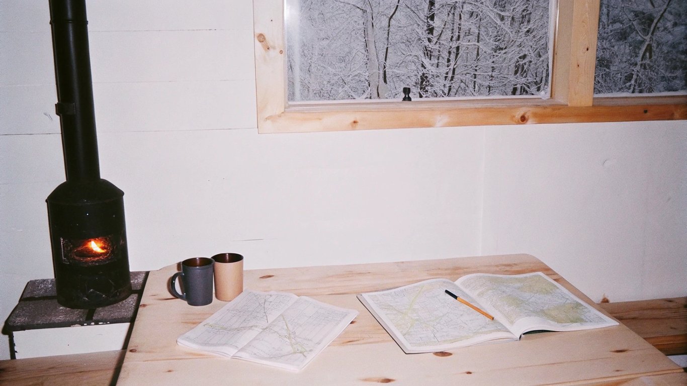 地板上鋪著幾層舊地毯,角落裡放著一台二手的取暖爐,火光搖曳著,把冷空氣驅散。木牆上貼著地圖和報紙剪貼:關於鎮子奇聞的小段新聞、幾張潦草的筆記、還有某人畫的怪物素描。桌子上堆滿了餅乾盒和咖啡杯——這裡更像是一間小實驗室兼客廳。