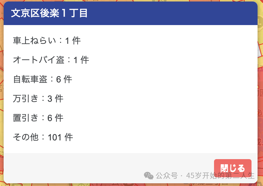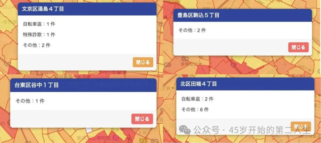 其餘如白山、小石川、千石、千駄木等地塊,犯罪紀錄非常稀少。