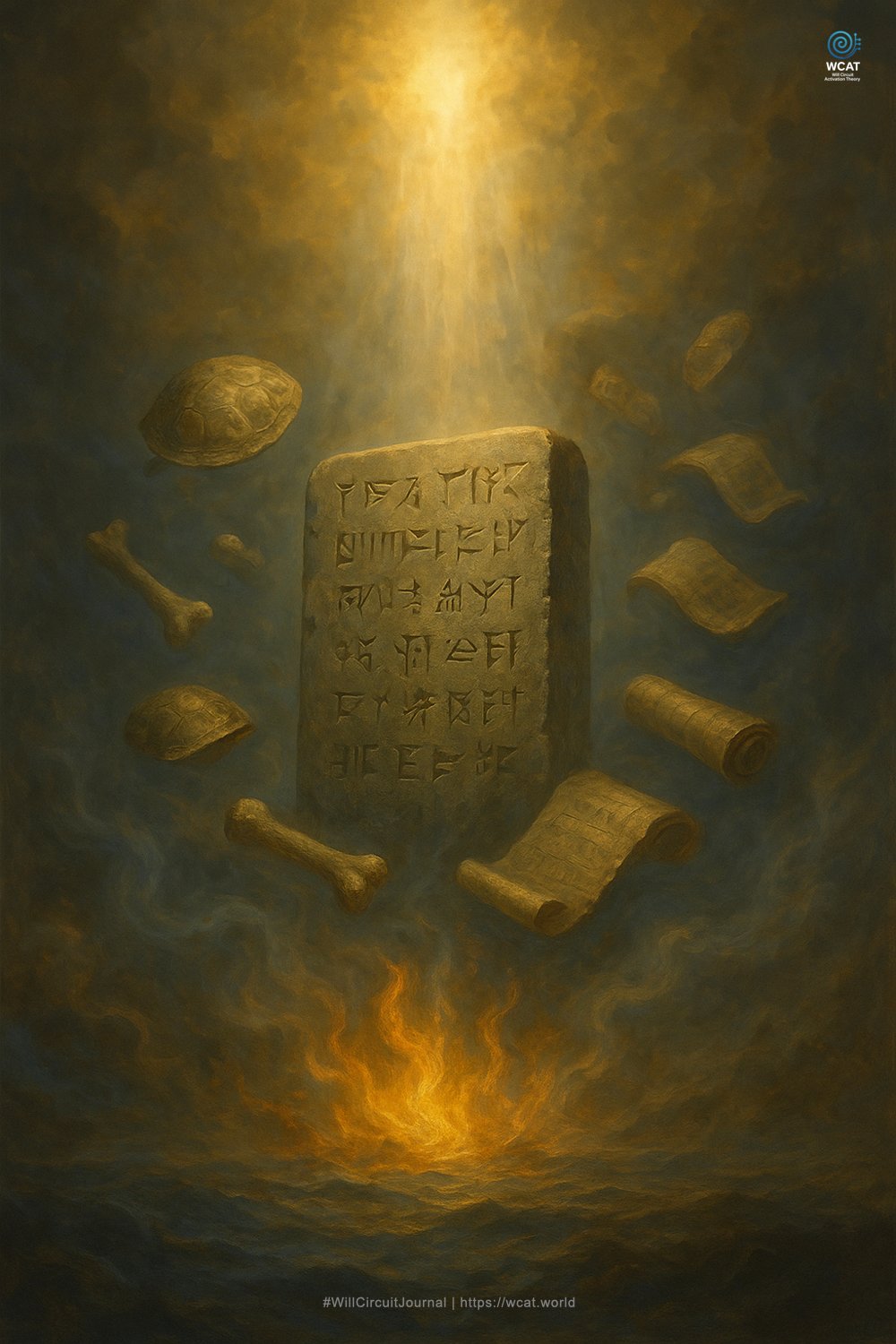 甲骨文(中國商代): 與務實的楔形文字不同,甲骨文誕生於一個充滿神秘與權威的世界。在商代,王權與神權緊密結合,國王不僅是人間的統治者,更是與神靈溝通的唯一橋樑。透過在龜甲和獸骨上刻下卜辭,商王朝將神明的旨意「寫入」物質世界。這些卜辭不僅記錄了事件,更創造了統治的合法性——每一次戰爭、祭祀或農事,都是神意在人間的具現化。當一個普通人看到刻有文字的龜甲時,他所看到的,不僅是冰冷的符號,更是王權與神權共同構築的宇宙秩序。這使得社會規範不僅僅是人間的約定,更被視為宇宙秩序不可分割的一部分,張力被穩固地鎖死在一個穩定的結構中。