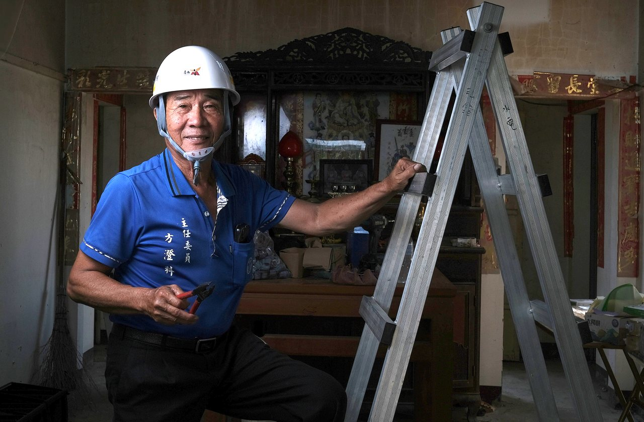 7 月的一個週間,七股區城內里金家熱鬧得像一場臨時工地,有人爬上鋁梯拉電線,有人拿著鐵鎚敲打隔間,也有人在屋頂上忙著修整瓦片。這是台南市「做工行善團」的志工,在團長方澄科的帶領下,分工有序、默契十足。