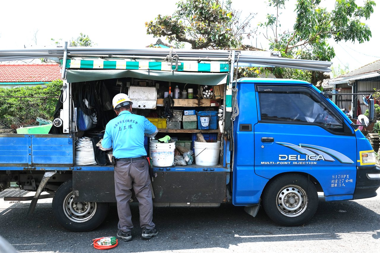 拉開側門,映入眼簾的是層層疊疊的抽屜與盒子,裡頭整齊收納著各式零件、工具與材料。因為志工們都是利用空檔趕來幫忙,時間有限,若臨時缺了什麼零件就會耽誤工程。為了避免這種狀況,他乾脆把小貨車改裝成隨身倉庫,走到哪裡都能即時支援。這份細心與堅持,正是行善團效率與默契的最佳寫照。
