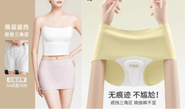 而在这样的语境之下,为“修正”这些被视为“问题”的身体特征,市场迅速推出相关商品:遮挡三角区的安全裤、内嵌护垫的瑜伽健身专用内裤……语言先行,商品随之而至,最终共同完成了对身体的塑形与否定。