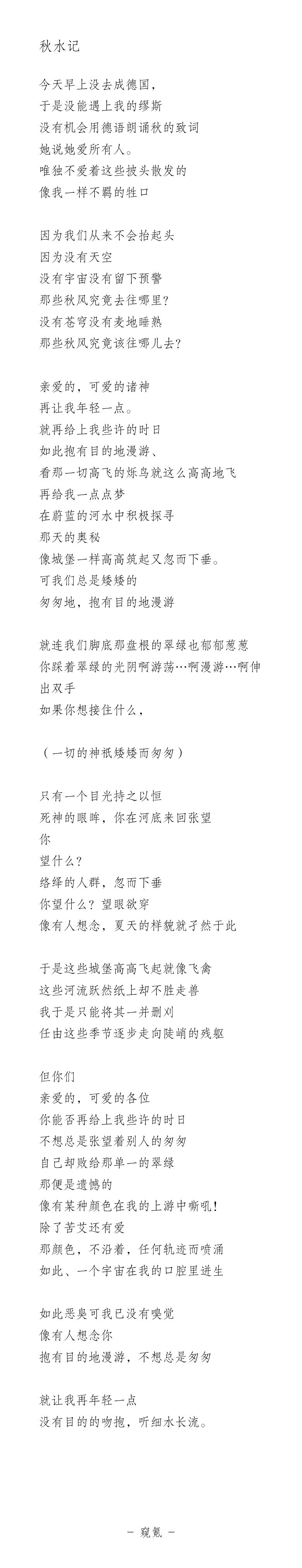 《秋水记》窥氪chiuenhong·8 小时前(修改过)·IPFS十五岁写的烂诗 诗歌CC BY-NC-ND 4.0 授权建议频道选择希望推荐到的频道(单选)生活事书音影旅・居性别/爱创作・小说时事・趋势身心灵没有适合的频道不参与频道推荐 (文章将出现在「还有」中)下一步喜欢我的作品吗?别忘了给予支持与赞赏,让我知道在创作的路上有你陪伴,一起延续这份热忱!支持作者支持作者2窥氪chiuenhong18岁,马来西亚青年诗人,作品发表于星洲日报、南洋商报,以及新加坡雨林诗刊。 来自作者相关推荐《哦,海鸥!》《惴叶》《丢手绢》22