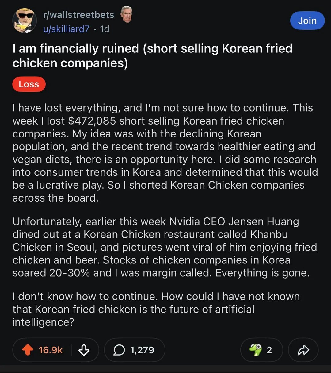 其实他是将韩国炸鸡和人工智能(黄仁勋)这两个完全不相干的事物强行联系在了一起,创造了一个荒谬的因果关系。潜台词是,我做了那么多基本面研究,分析了那么多数据,结果却输在了一条娱乐新闻上。我怎么可能想得到,判断炸鸡公司的前景,关键不在于它好不好吃,而在于它能不能得到AI之神的垂青?这个市场的逻辑太荒谬了,我的失败也太离谱了。