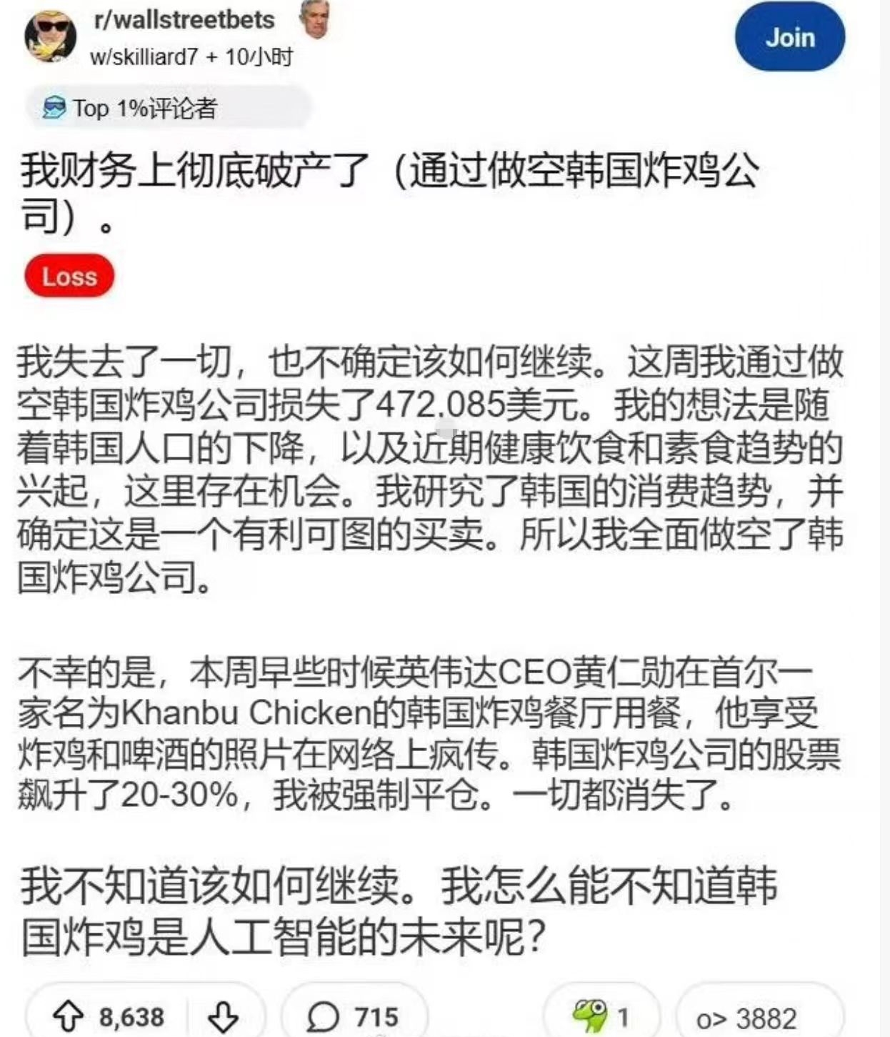 没过多久,投资社群中就流传出一张截图。一位网名为“u/skilliard7”的投资人自述,他因做空韩国炸鸡公司股票,在一周内损失了47.2万美元,陷入财务绝境。