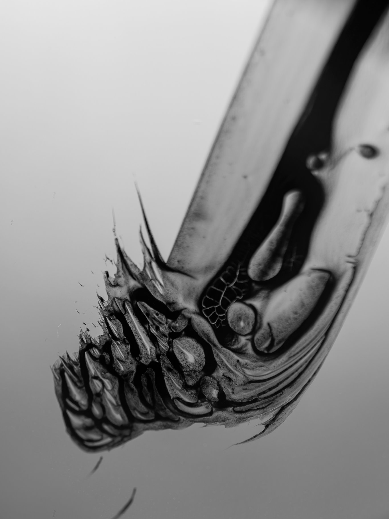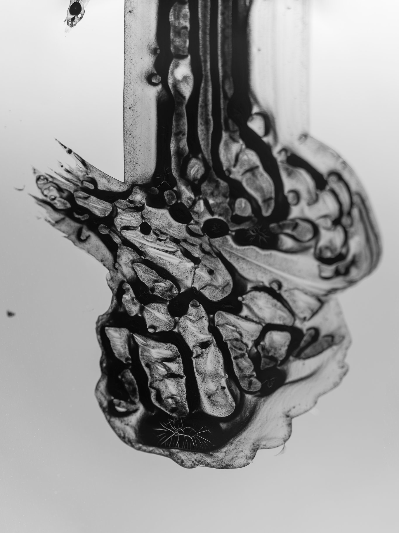 但它真正令人吃驚的地方,不只是「細節很多」,而是當解析度高到某個程度之後,你看到的已不再是字寫得如何,而是字裡面竟然還藏著另一個層級的生成。那裡面有重力、有收縮、有乾裂,有像神經末梢一樣的白色細紋,有像腐蝕邊界一樣的灰黑過渡。你拍下的是幾個字,顯影出來的,卻像是字的屍骸、殘響,和它體內另一種更古老的生長。