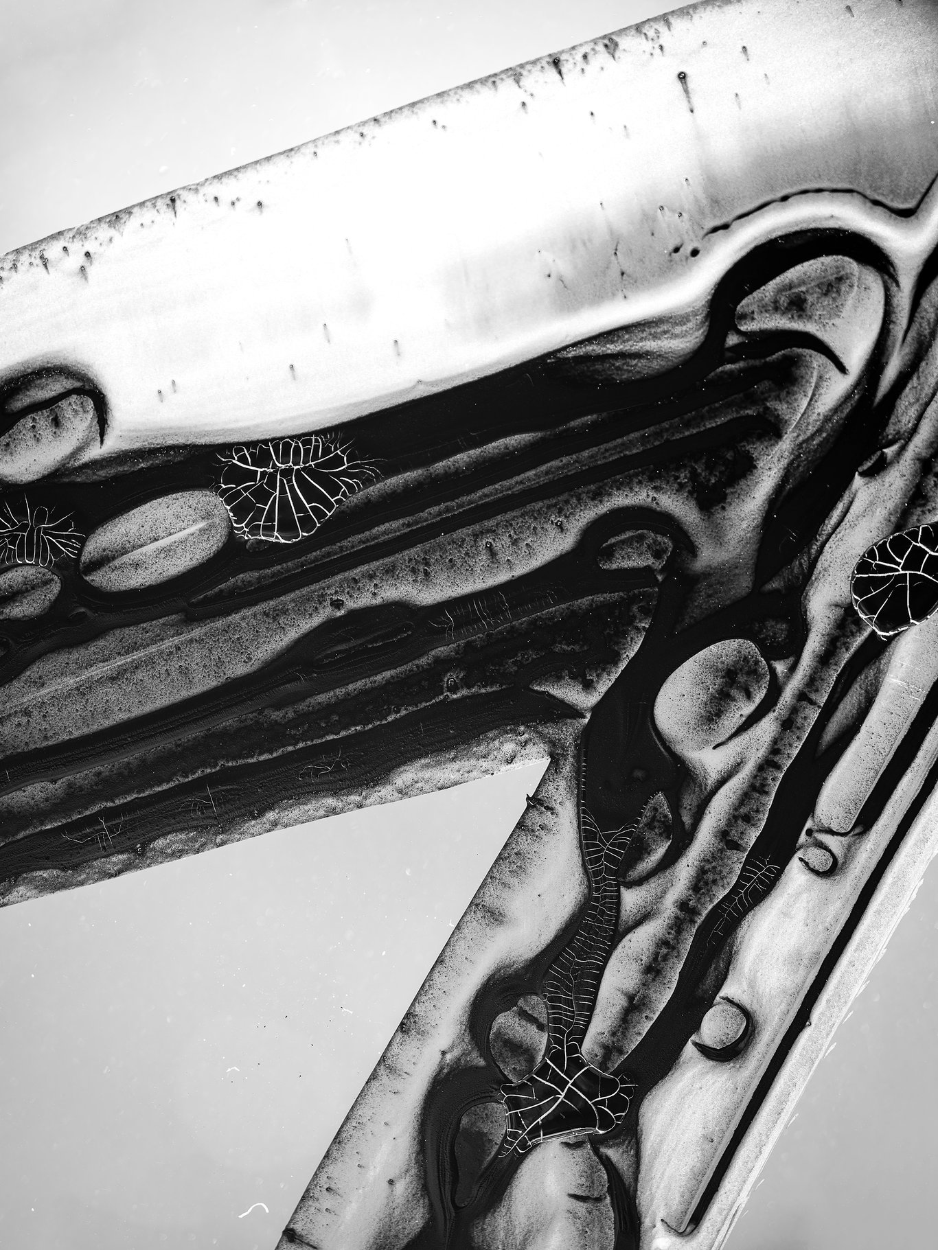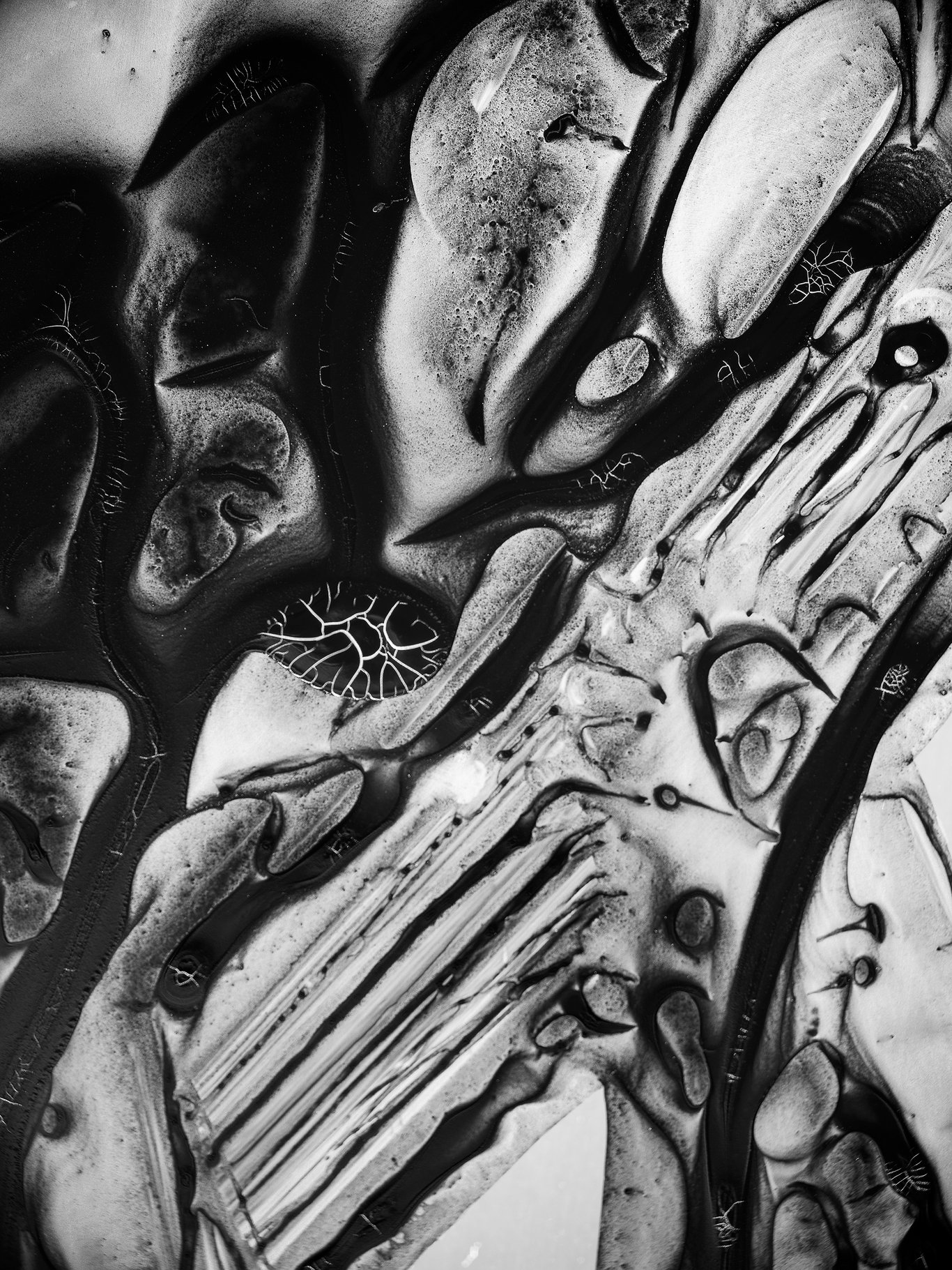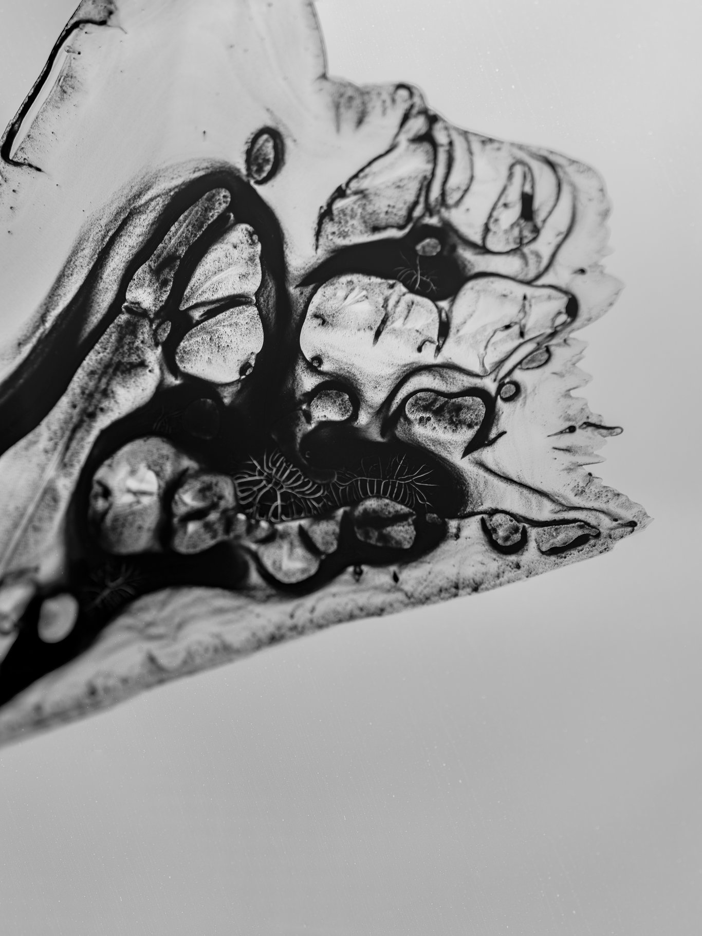 鏡頭一旦逼近,原本還能閱讀的字,很快便失去了語言的穩定性。橫畫不再只是橫畫,豎畫也不再只是豎畫;它們開始像沉積層、像礦脈、像葉脈、像菌絲,像某種尚未命名的皮膜或器官。筆畫裡的黑與白,不再僅僅是墨色濃淡,而像液體乾涸之後留下的邊界、裂紋與回縮。那些細小的白色皸裂,尤其像是從墨內部長出來的,並不是我「寫」出來的,而是它在停留、收縮、乾裂的過程中自己顯出來的。