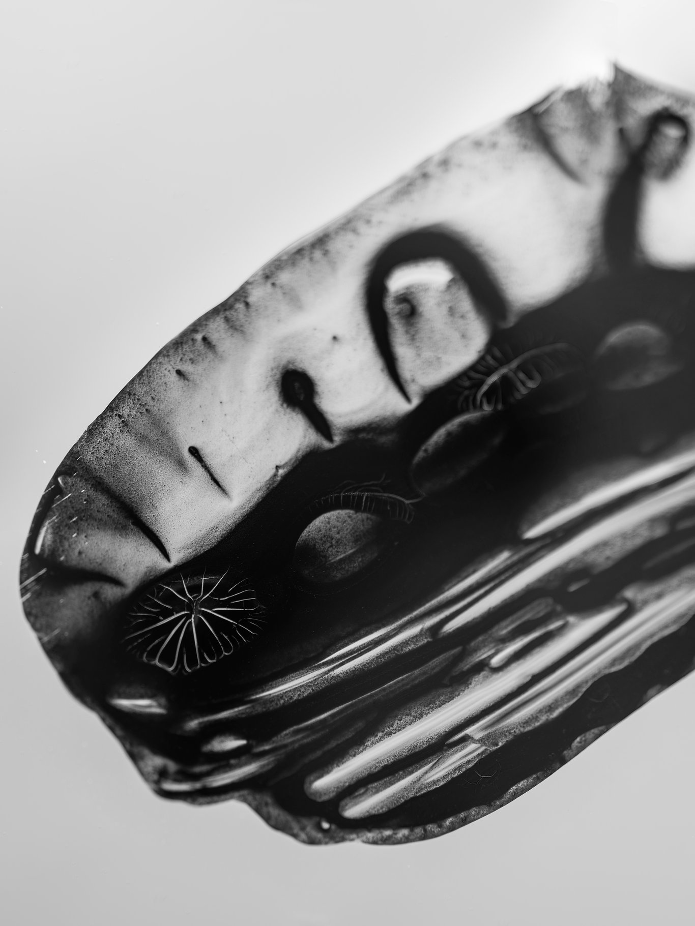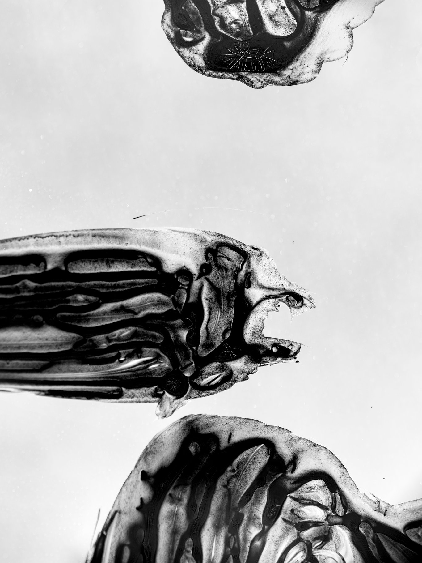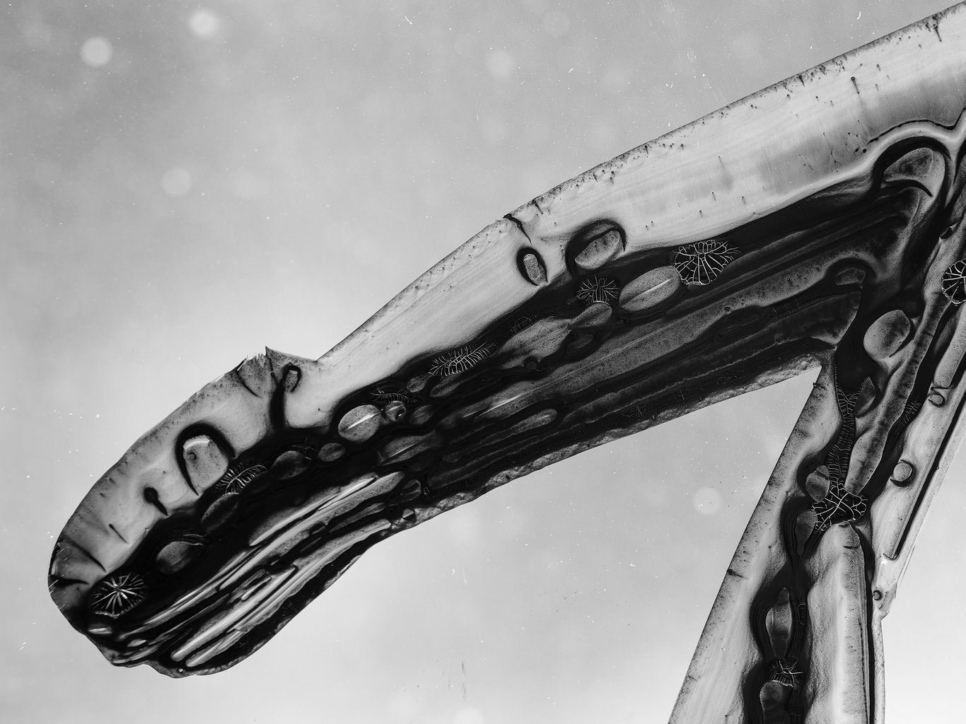 鏡頭一旦逼近,原本還能閱讀的字,很快便失去了語言的穩定性。橫畫不再只是橫畫,豎畫也不再只是豎畫;它們開始像沉積層、像礦脈、像葉脈、像菌絲,像某種尚未命名的皮膜或器官。筆畫裡的黑與白,不再僅僅是墨色濃淡,而像液體乾涸之後留下的邊界、裂紋與回縮。那些細小的白色皸裂,尤其像是從墨內部長出來的,並不是我「寫」出來的,而是它在停留、收縮、乾裂的過程中自己顯出來的。