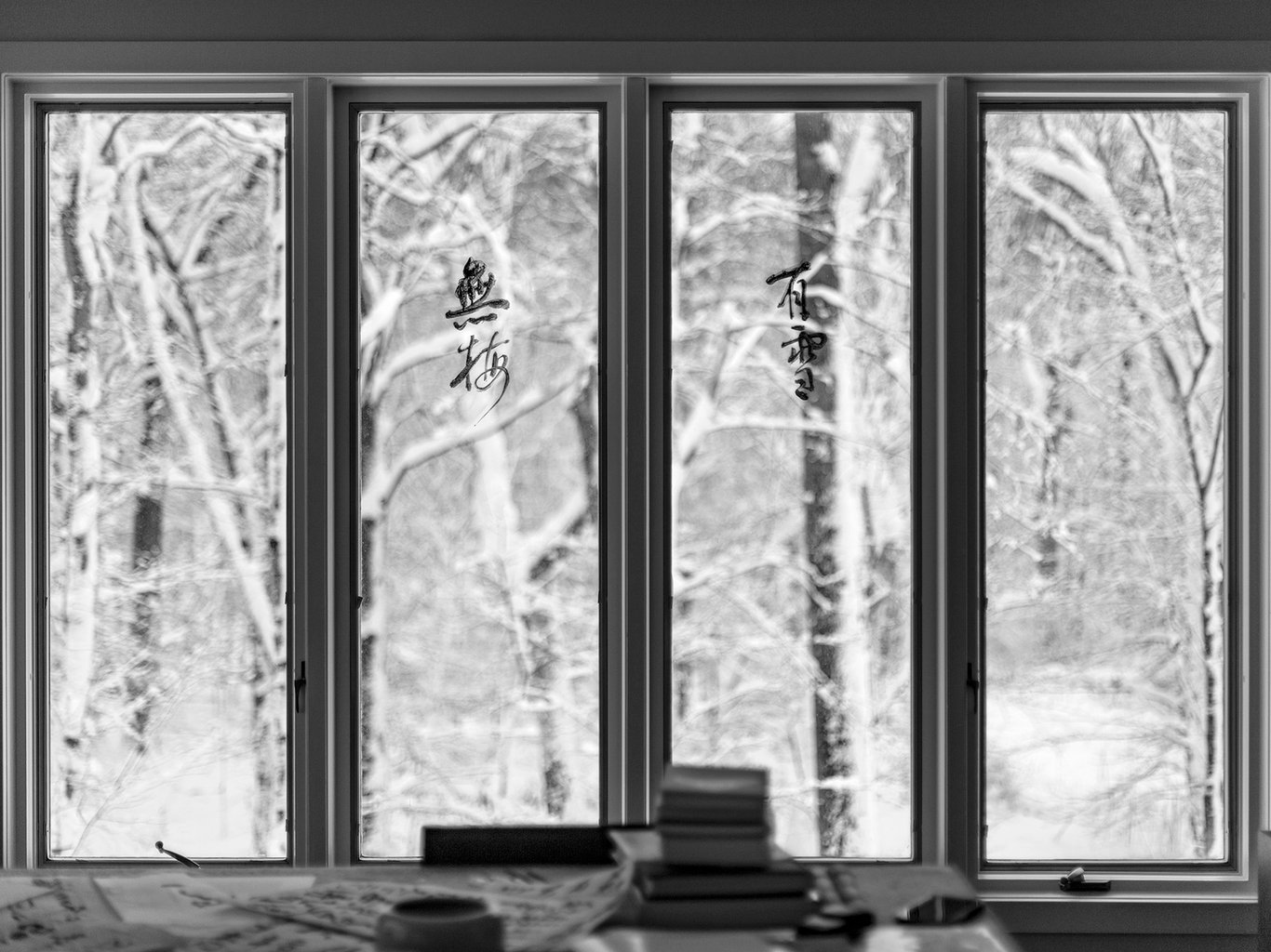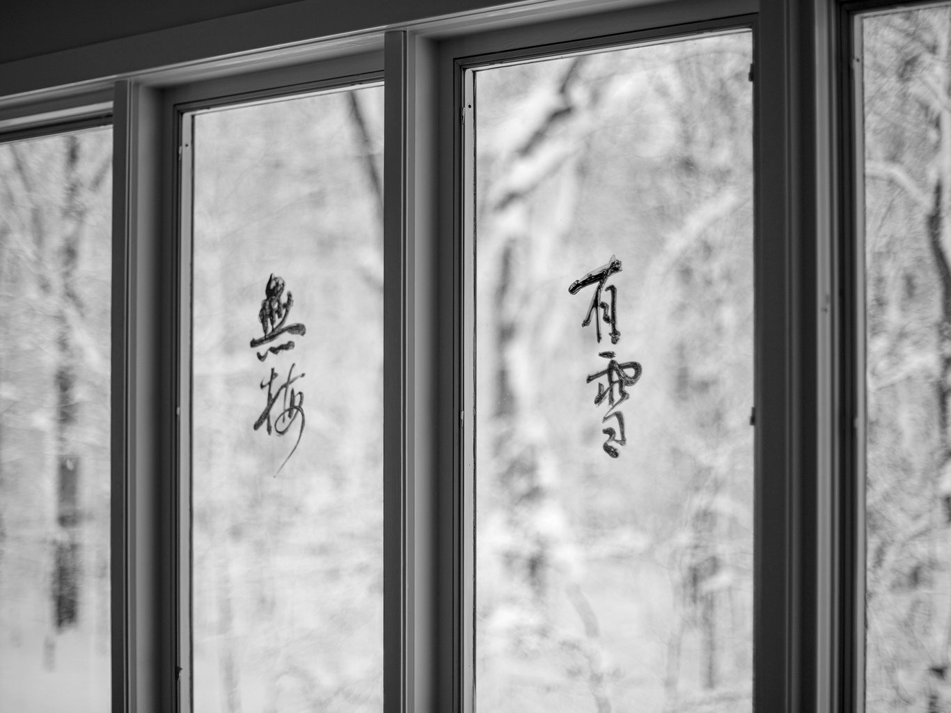 前幾天,正因為這個誤記,我心裡忽然生出一點說不清的感慨,隨手便在對著美東雪林的窗玻璃上,寫下了「有雪」與「無梅」四個字。