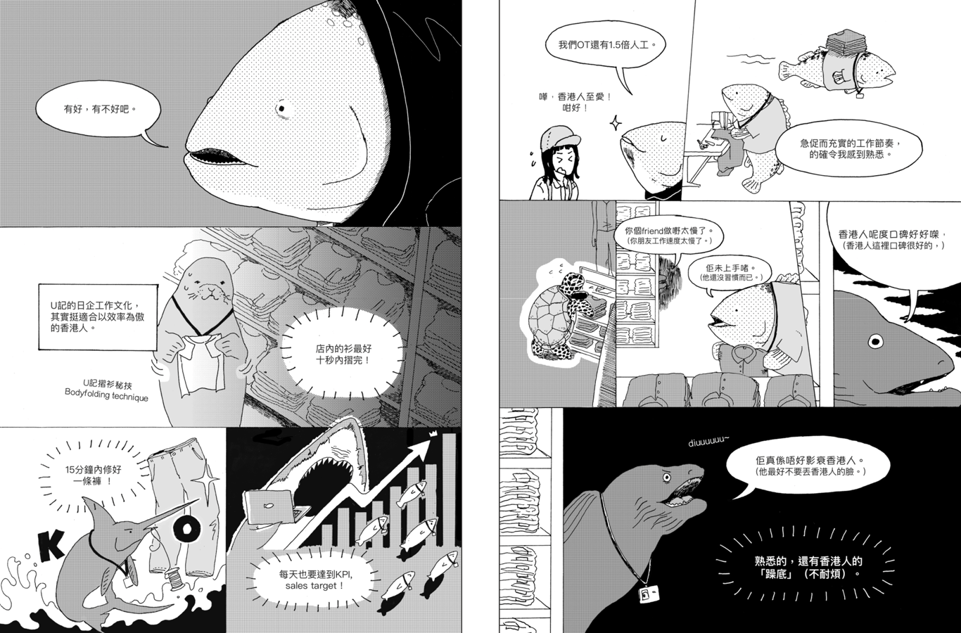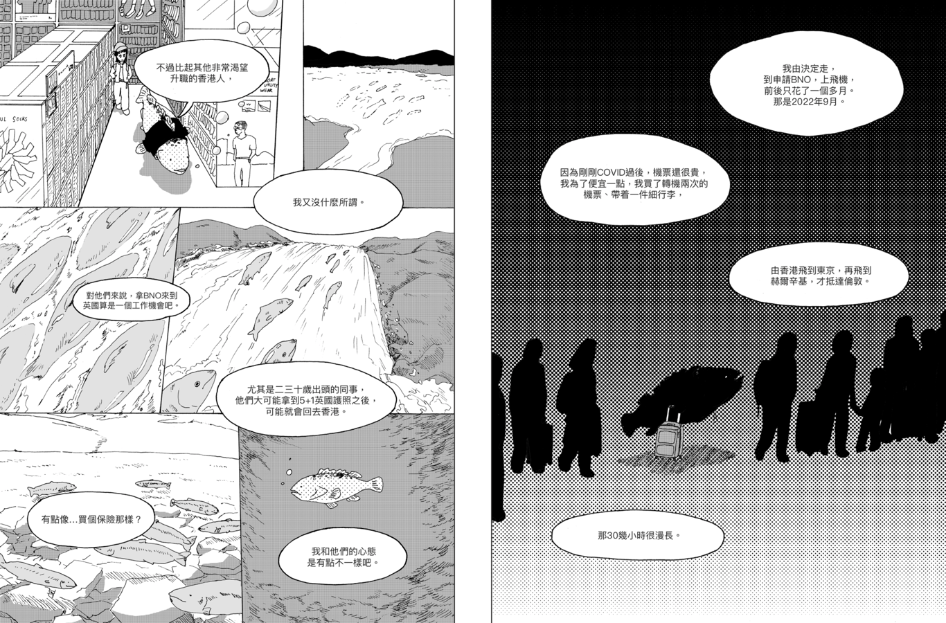 也正是在這種並行的深度理解下,創作者才能發展出高階的視覺表現技術,順利引發讀者共感、聯想,轉譯所關注事件或對象的核心。黃珮珊在分享這一季「在場・非虛構漫畫獎學金」幾部獲獎作品時提到,當創作者經由深度理解,尋找到最適合的視覺呈現邏輯,去處理那些「如果光看文本,沒辦法直觀理解或說明」的抽象感受時,就能讓讀者願意進一步好奇、思考。例如,其中一部討論移民的作品中,創作者便是將主角畫成海洋動物,以此作為某種身分認同的隱喻。