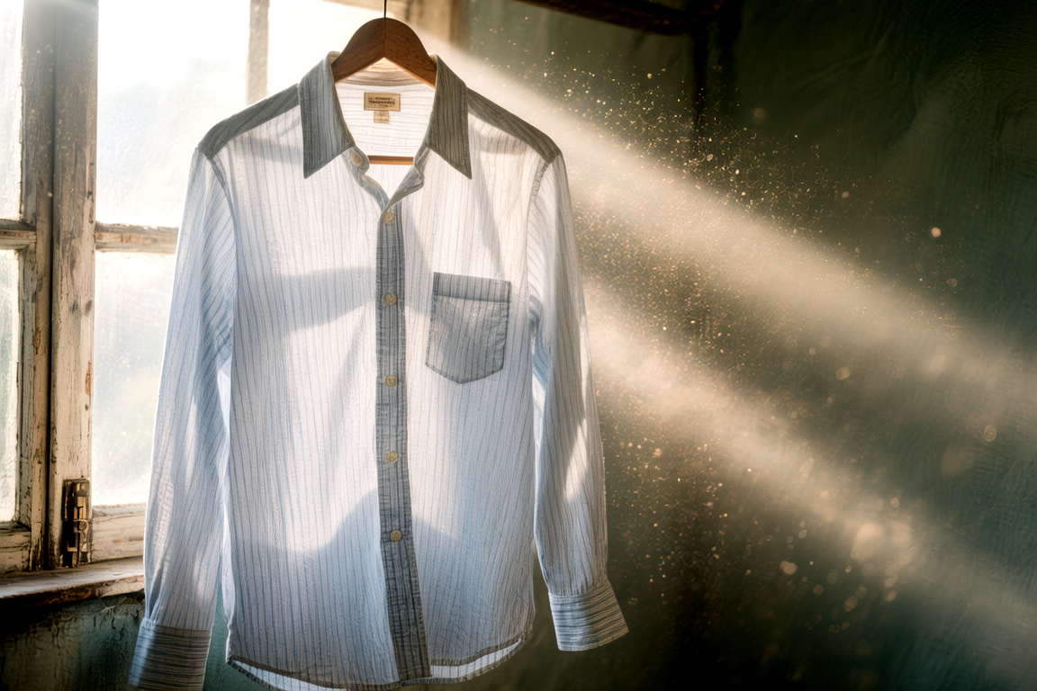 因此,这件直接买来的、带着出厂折痕、有显眼浅蓝竖纹的白底衬衫,是个异数。