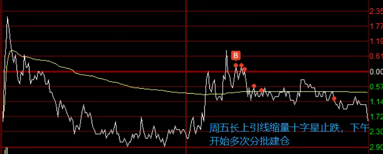 上周五止跌十字星,上引线较长,说明有做多力量进场,从而被我关注加入自选,周五下午开始多次介入,分批建仓。