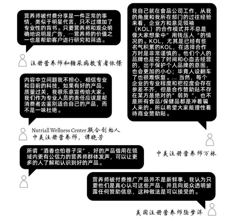 “撇开注册营养师,有很多自称是营养专业人士或者没有科学背景的网红、明星已经在用自己的名气和影响力获取这方面的利益。我更愿意看到是注册营养师在做这项工作,至少大部分的营养师在筛选产品和做出推荐的时候是基于科学、基于职业道德的。”
