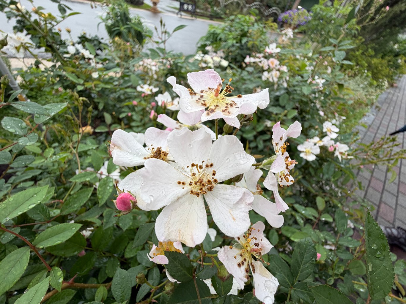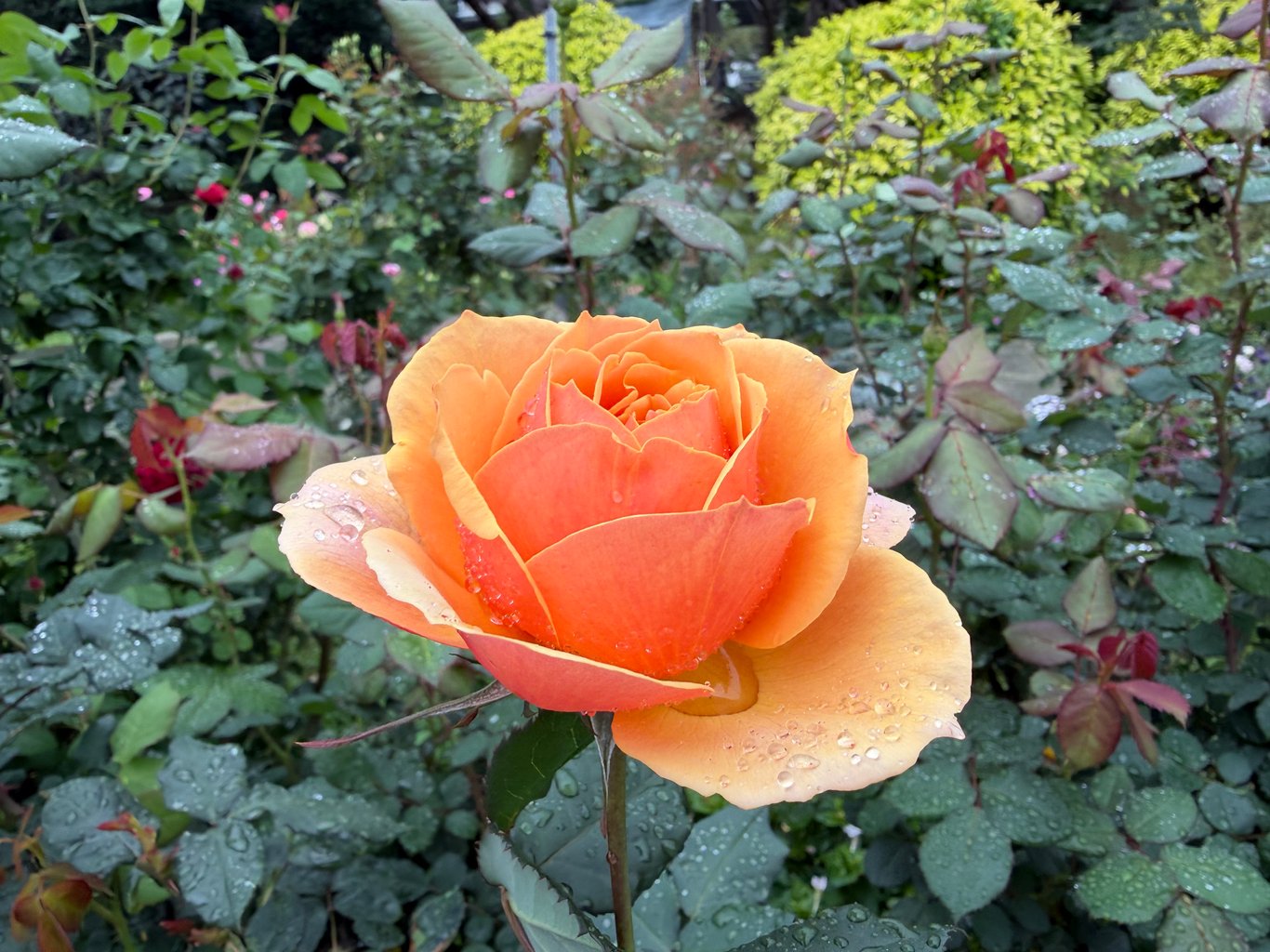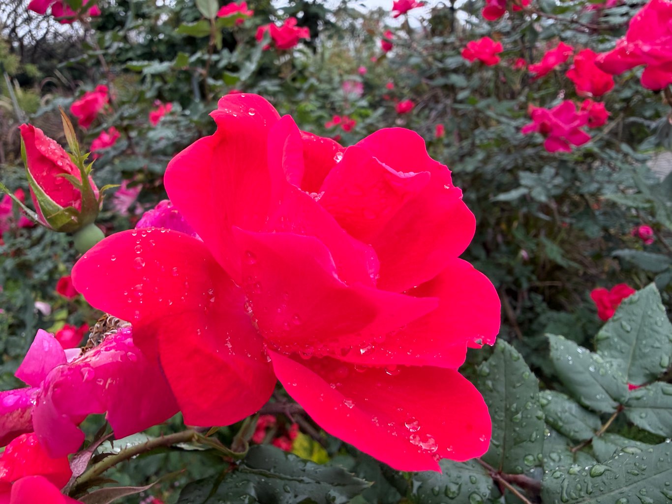 它們好漂亮。雖然碩大的玫瑰花被雨水壓低了頭,但無論是花型、花色、單重辦種類,琳瑯滿目,都很吸引人。花瓣上圓滾滾的水珠,讓玫瑰們顯得更加嬌豔欲滴,比之晴天艷陽下的玫瑰,楚楚動人得多。
