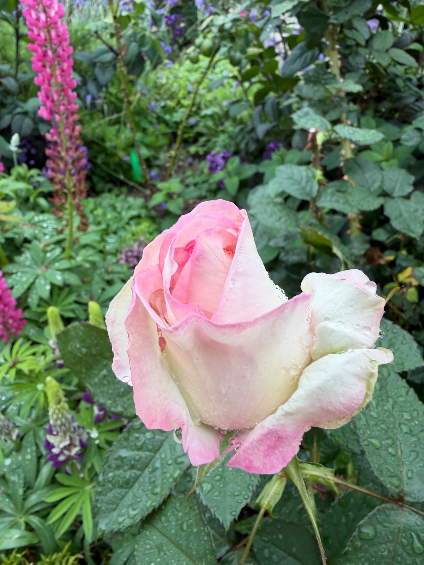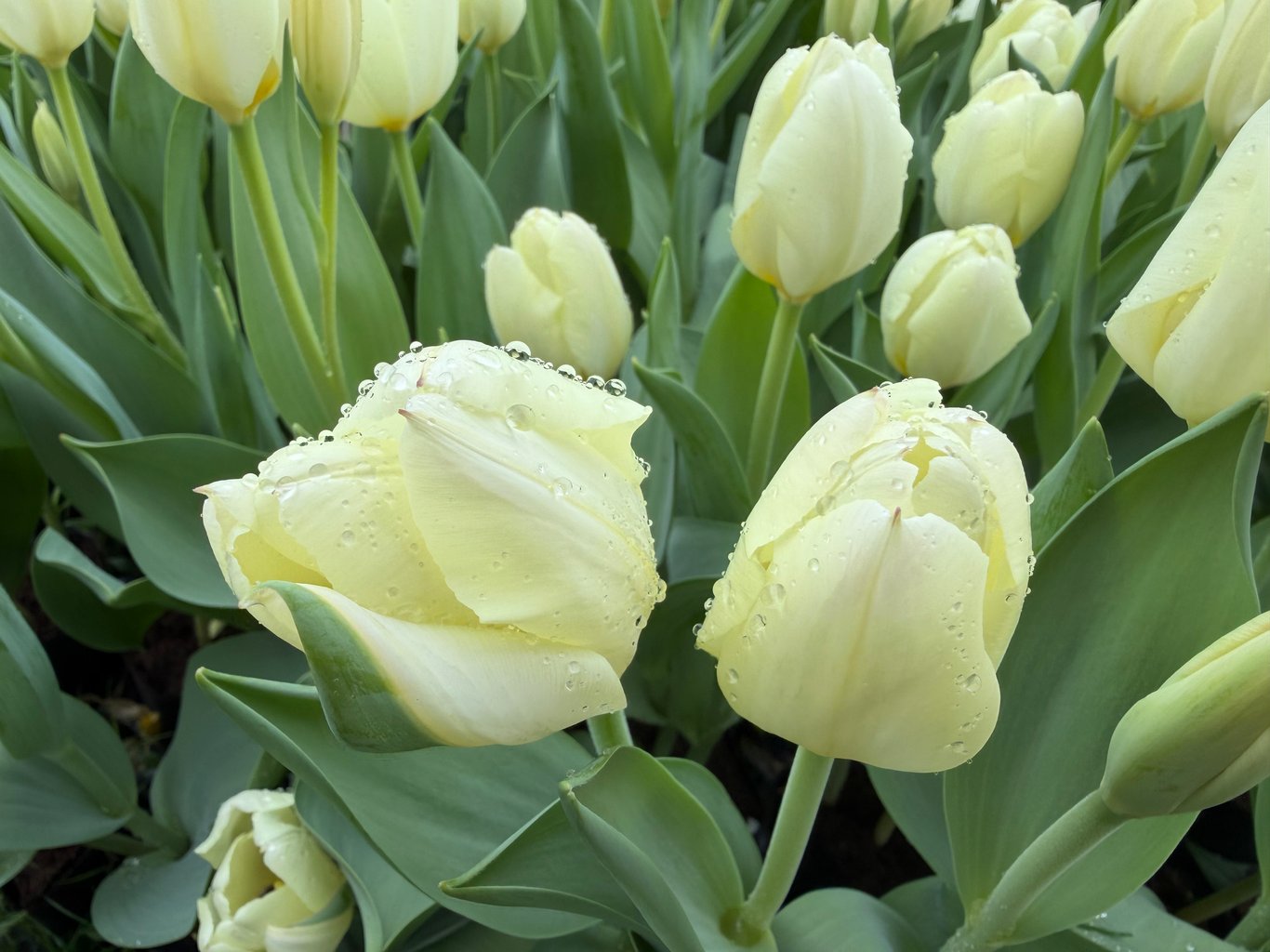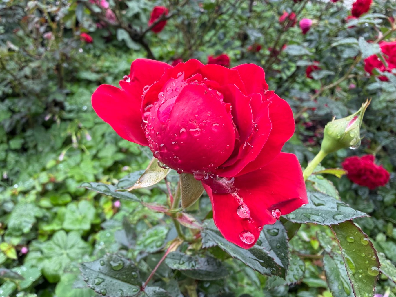 它們好漂亮。雖然碩大的玫瑰花被雨水壓低了頭,但無論是花型、花色、單重辦種類,琳瑯滿目,都很吸引人。花瓣上圓滾滾的水珠,讓玫瑰們顯得更加嬌豔欲滴,比之晴天艷陽下的玫瑰,楚楚動人得多。
