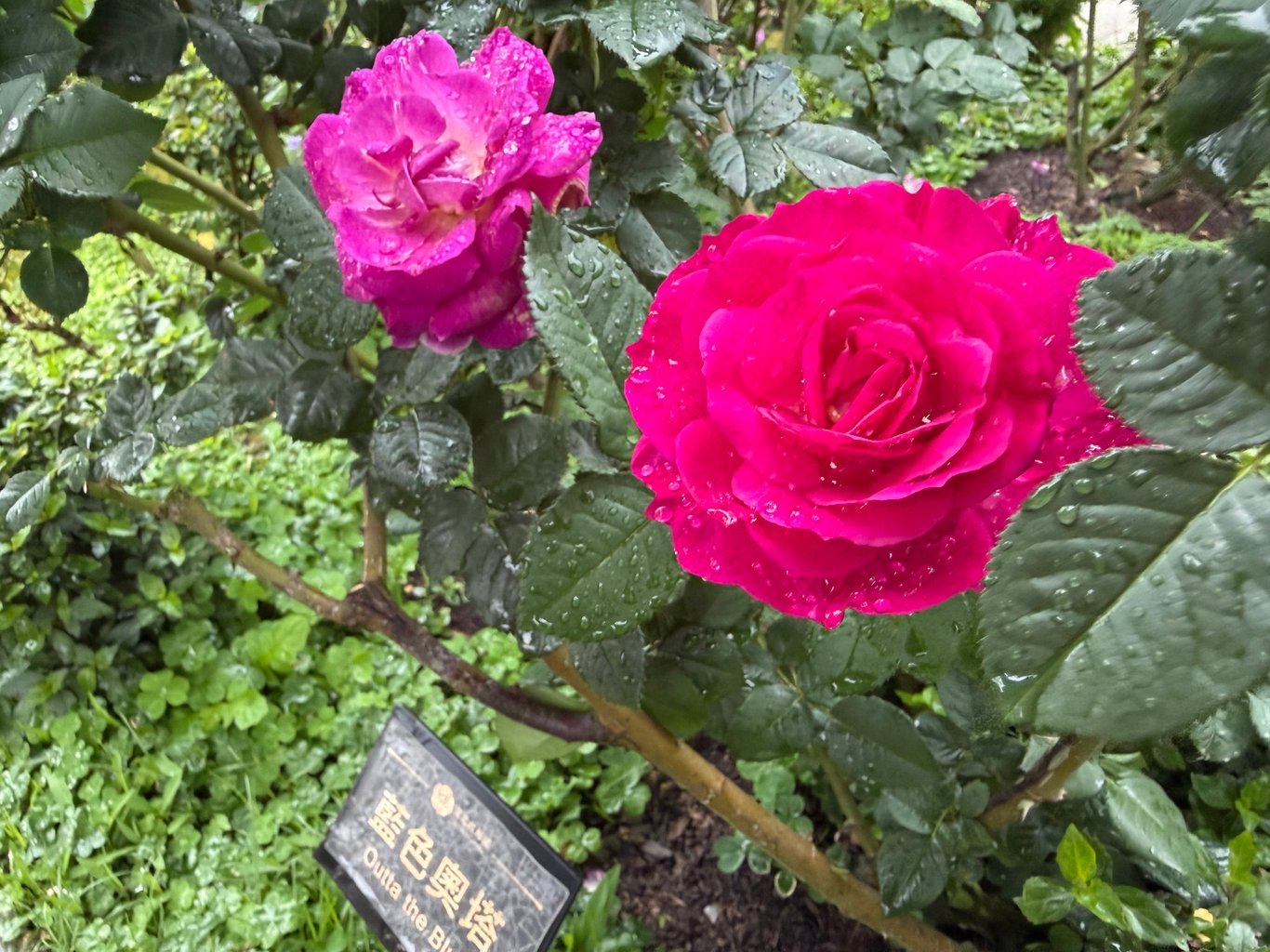 在一株名為「藍色奧塔」的濃桃紅色玫瑰前,我們三人討論許久。這名為「藍色奧塔」,看起來卻和藍色一點關係都沒有?外文系出身的K看到英文名字 Outta the Blue 時說,這英文原意是「出乎意料」,是否錯誤命名。