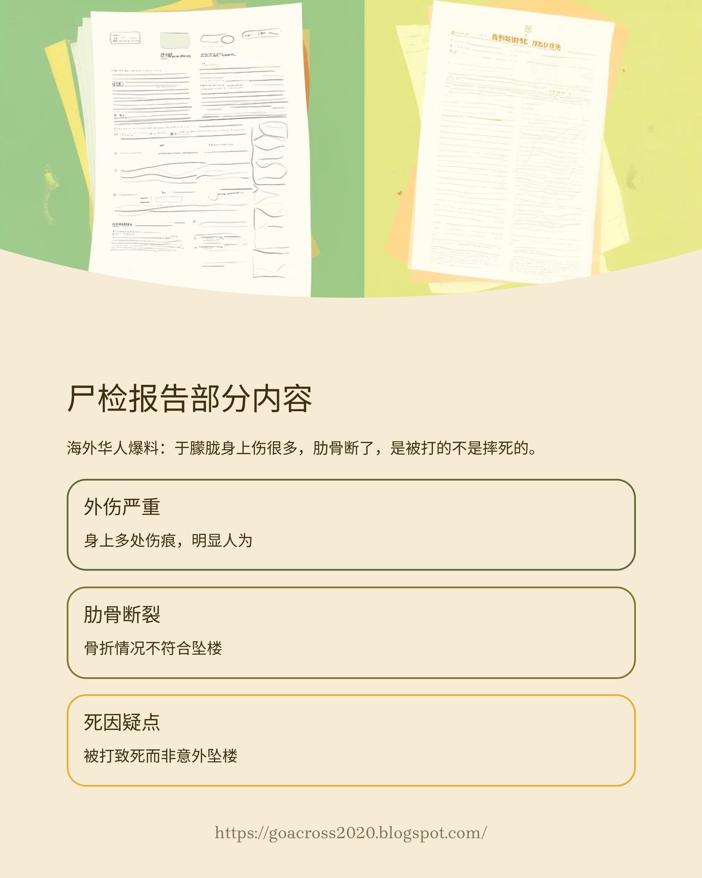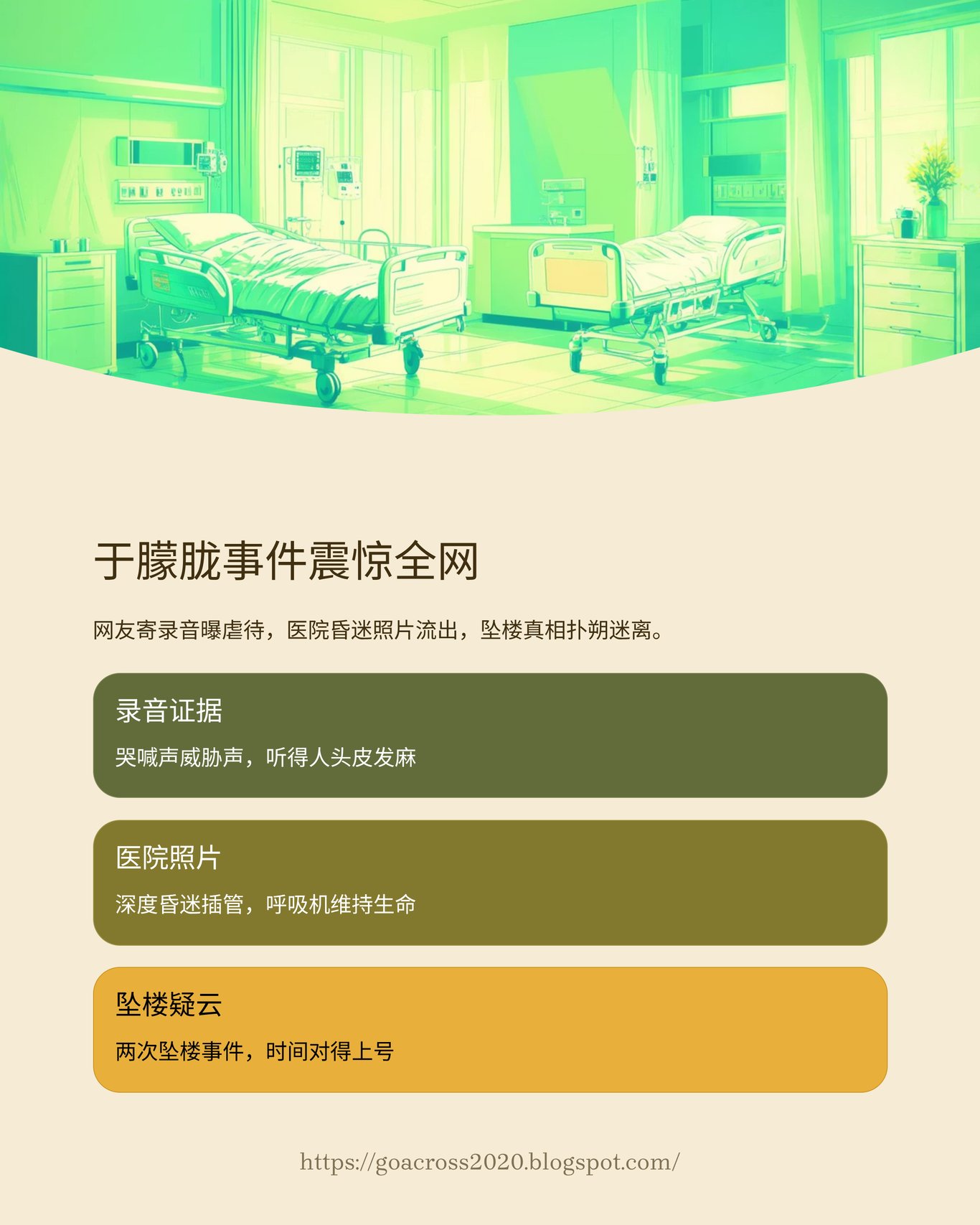 网络上流传出多项惊人指控:一份据称是于朦胧遭受虐待的录音被曝光,其中包含哭喊声与威胁声;另有照片显示,于朦胧在去世前曾在医院深度昏迷,身上插有管子并佩戴呼吸机,这与早前他两次坠楼的传闻相吻合。