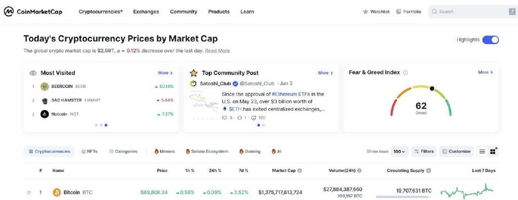 行情监测软件:CoinGecko、CoinMarketCap,查询排名、市值及交易量。