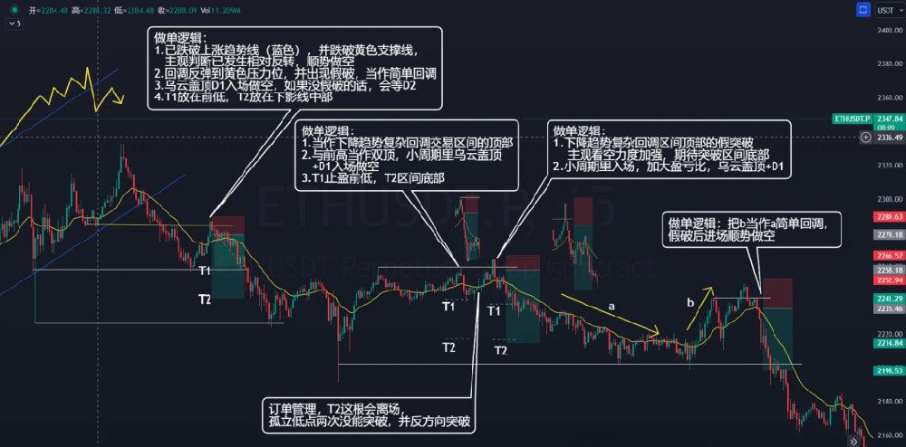 复盘历史走势,标注所有潜在机会(如图十、图十一),例如: - 下跌趋势初期的上涨楔形顶部做空。 - 非末期跌势中的FB结构做空。 - 上涨趋势初期在区间底部做多。