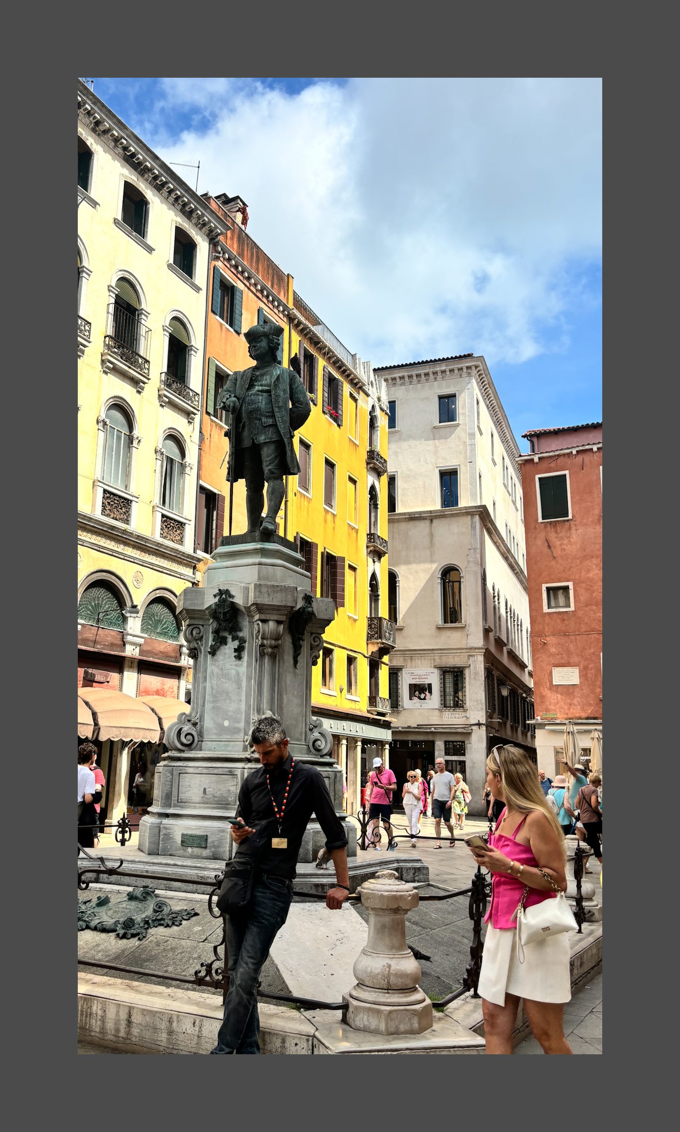 不知道名字的小广场上,立着《一仆二主》的作者,剧作家卡洛·哥尔多尼的纪念碑。导游模样的男子背靠着这位三百多岁的雕像,倚栏的站姿很是悠闲。