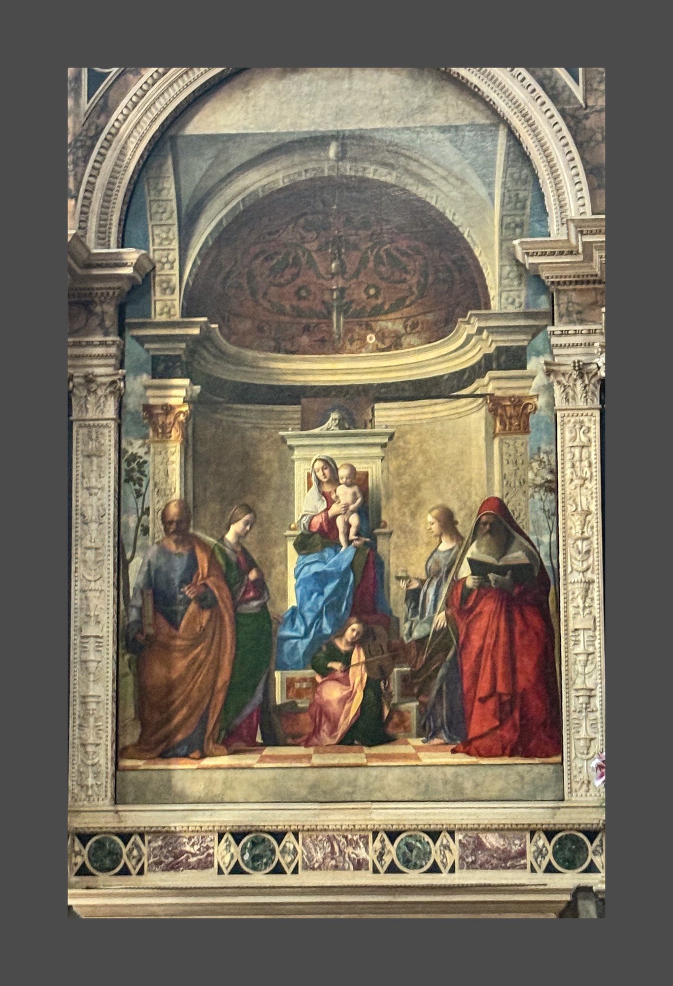教堂的祭坛画——乔瓦尼·贝利尼的《圣母子与圣徒》,整幅画静谧而均衡,光影柔和渐变,技法成熟老到。此作完成时贝利尼已年过七旬,却极富革新精神,是威尼斯画派“诗意风格”的起点。