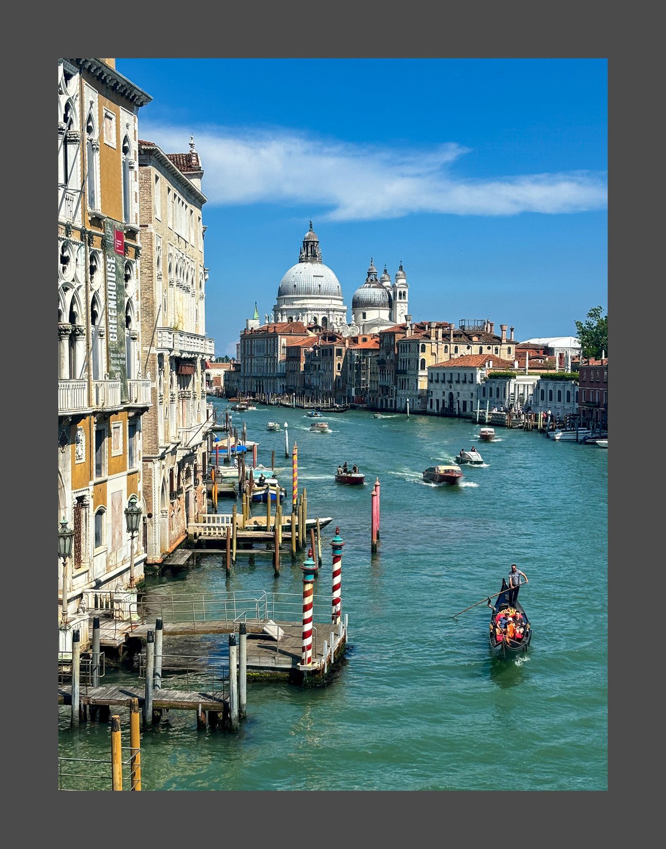 不多远处,是横跨大运河四座主桥之一的学院桥。桥上人流如织。驻足倚栏望去,运河S型的弯道处,是巴洛克风的安康圣母教堂穹顶。教堂两侧是威尼斯典型的文艺复兴式红屋顶建筑,在阳光下分外耀眼。运河的绿波上,贡多拉和各色船只扑面而来,船头划破水面带着漂亮的白色水痕。