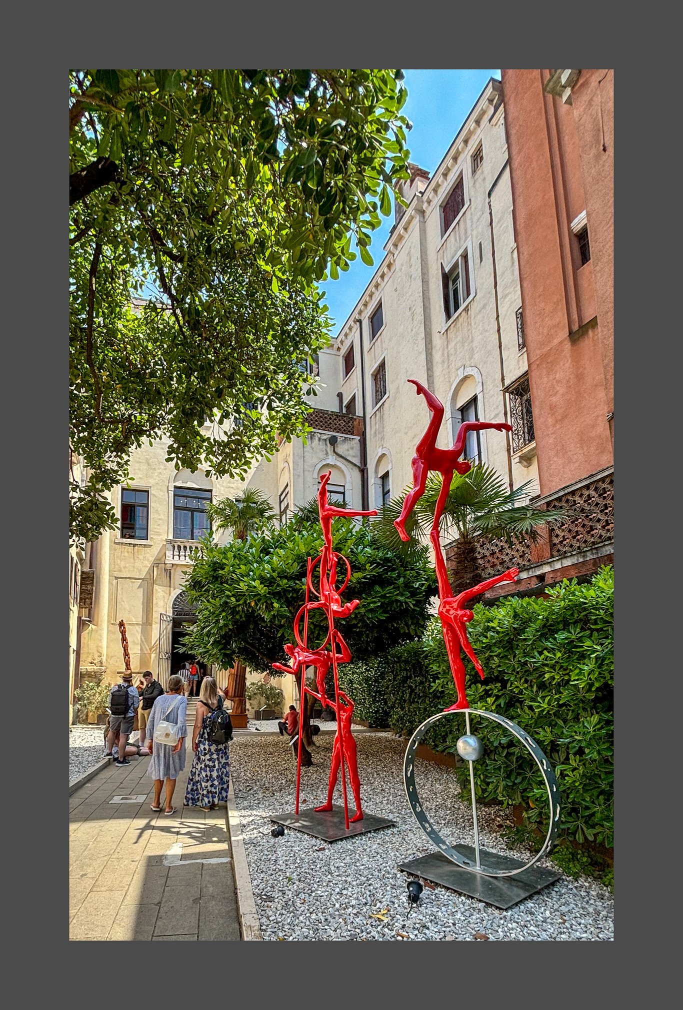 就这麽一路朝南地逛着,不想竟到了莫拉宫——现在的欧洲文化中心。这座文艺复兴建筑,斑驳的粉墙,繁复的哥特式窗棂,门前红色人形雕塑格外抢眼。