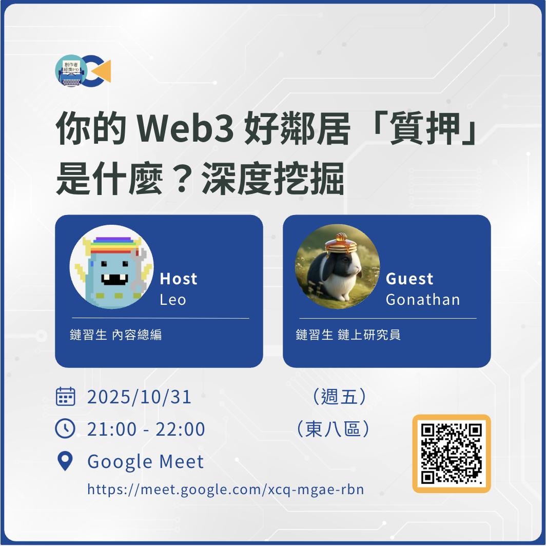 這場活動 GGbear 將帶你循序漸進認識「質押的意義與演化」、PoS(Proof-of-Stake)如何用經濟誘因創造安全、還有流動性質押與再質押背後的風險⋯⋯更重要的是,他將回到質押的初衷:我們每一位使用者,都是 Web3 公民的一份子,而質押,就是最具體的參與方式。