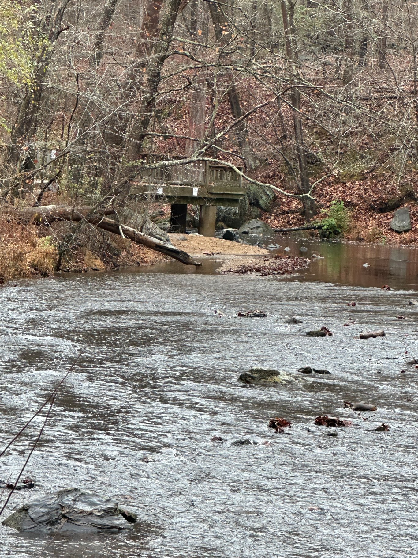 因为下过雨,连这河里的水位都高了不少。原本这里天晴的时候,会有人在河里钓鱼。今天除了见到一人外,遇见的都是跟我们这样来走路的。