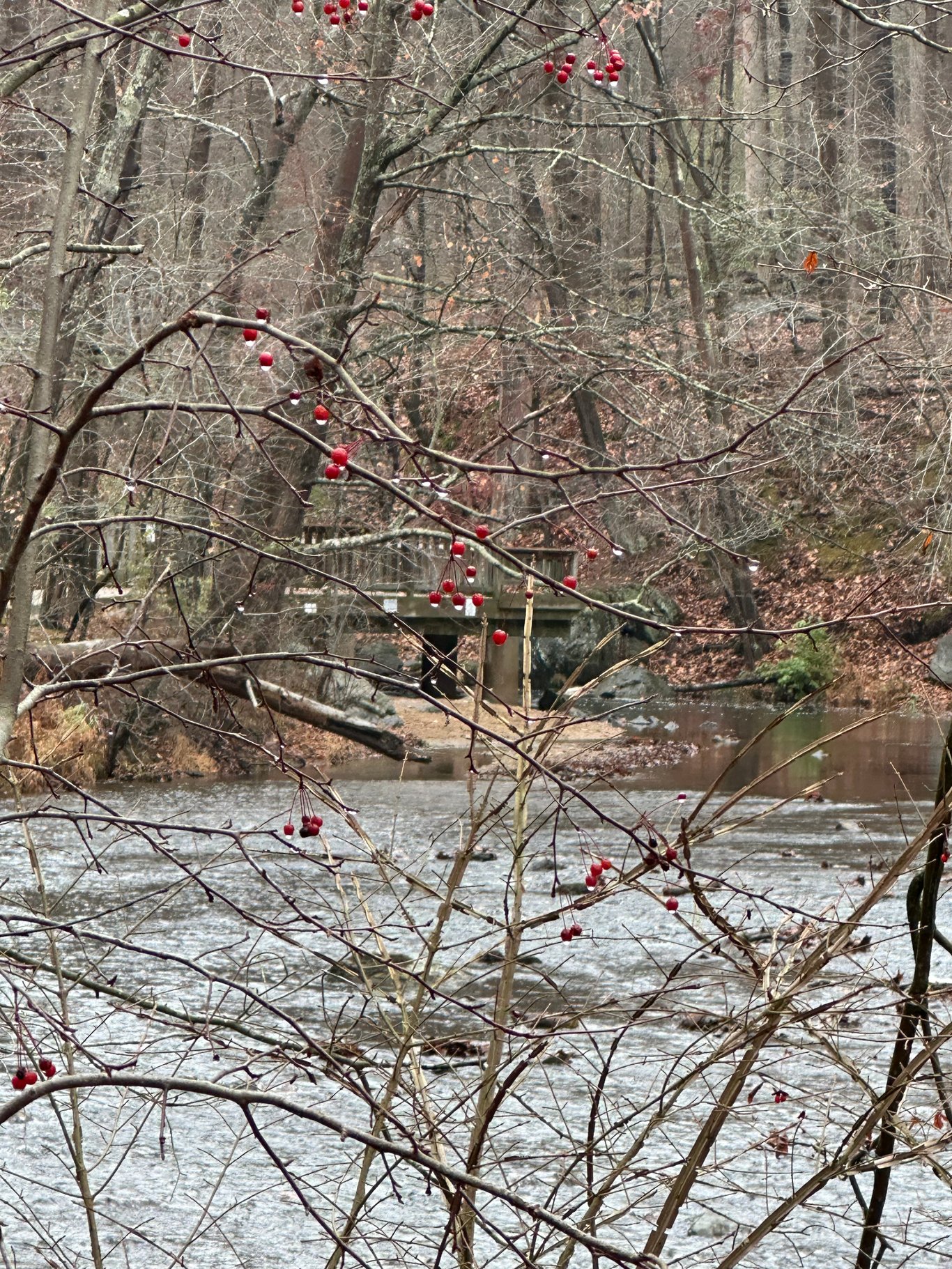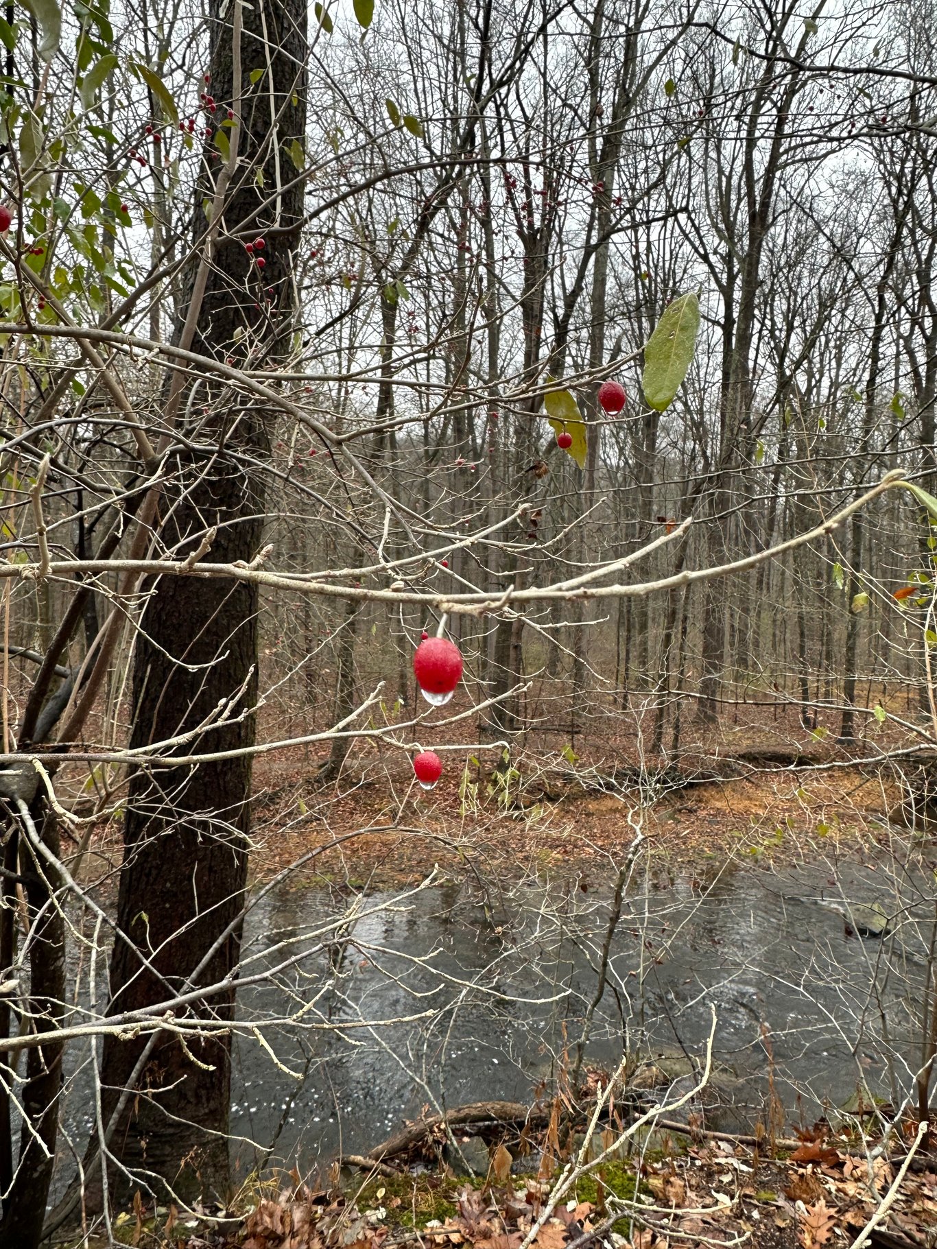 因为刚下过雨,一切看上去都那么的透彻。路边光秃秃的树干上的红色果子,还带着雨滴,显得特别地红。