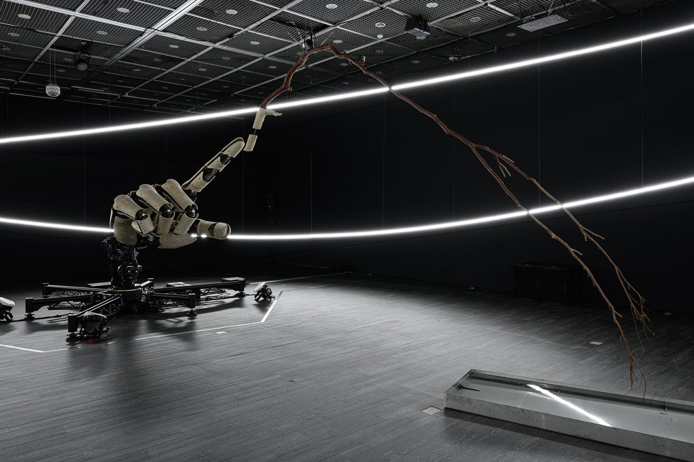 一踏入展間,頓時來到異世界,一隻偌大的機械手掌緩緩的扭動每根指節,從握拳、舒展、指向觀眾、比數字,每一刻都在變換著,而動作、光線、音樂、樹枝也隨之改變。這是展覽中使我最震撼的作品,巨大的道具、宇宙般的氛圍,將我暫時抽離忙碌的生活,緩下來思考。展間的變動講述著人生的起伏,告訴我每一刻的決定,會牽動著周遭的人事物,過程就像作品中有明亮有暗淡,無論如何,一切就是一場持續進行的精采故事。
