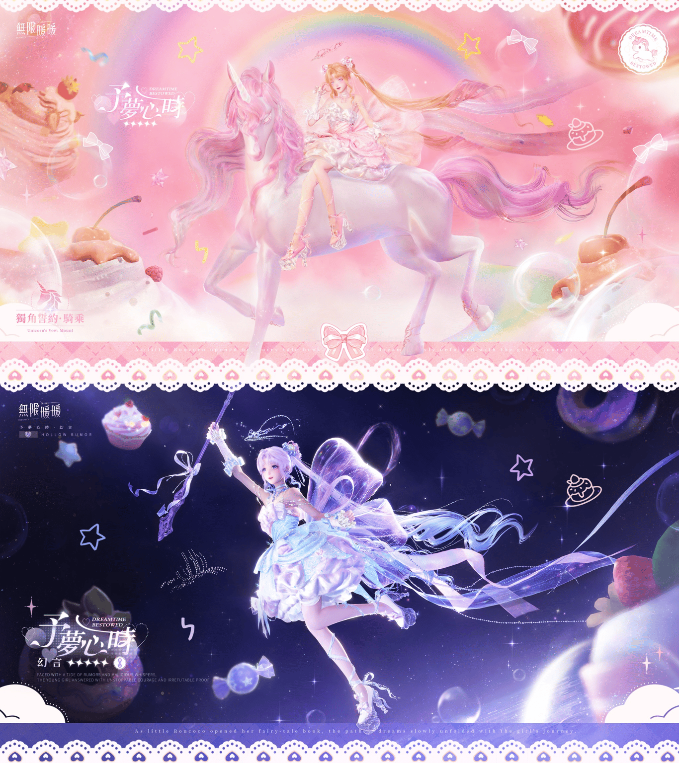 五星套裝「予夢心時」:解鎖能力「獨角誓約·騎乘」,可召喚獨角獸,並在跟隨、騎乘、騰空、疾馳四種狀態間自由切換,享受自在漫遊。