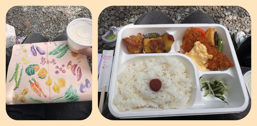 我们的午饭安排了丰岛厨房。后来我才在册子上看到这也算是艺术祭的一部分。那块齁咸的梅子完全无法克服理性去食用它。意外的是豆汁很好喝。我们在室外像日本人一样啃完了便当盒,好在天气很凉爽,也没有蚊虫。