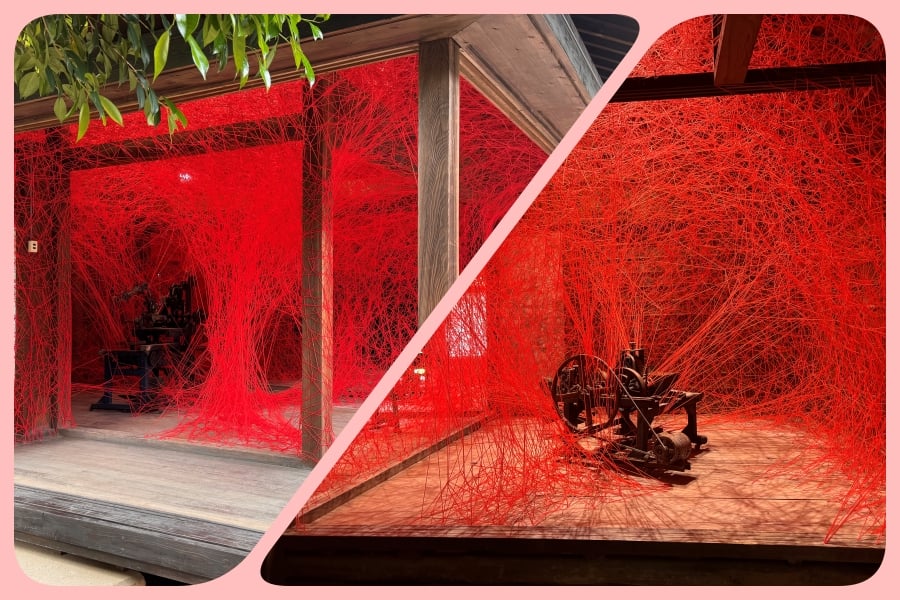 我时常觉得生活充满了奇妙的巧合。不久前我才刚在查询纤维艺术的时候看到过盐田千春的名字,此刻我却站在了她真实的作品前。她独特的艺术语言让人看到这件作品就会想到她:旧时的做面工具(我并不知道学名,只知道作用)被红线将其和废弃房屋缠绕在一起。就算并不明白被缠绕的东西是什么,这强烈的记忆性和怀旧感也是扑面而来。这便是优秀艺术品的特性之一。不需要语言解释就能传达到信息。