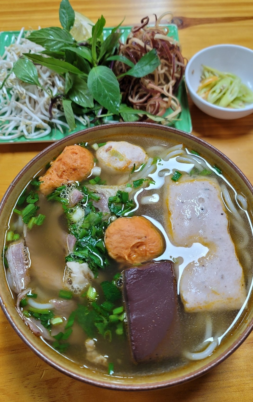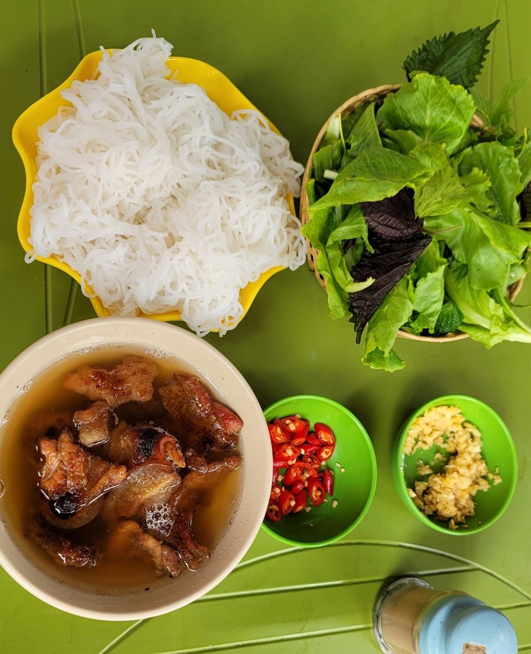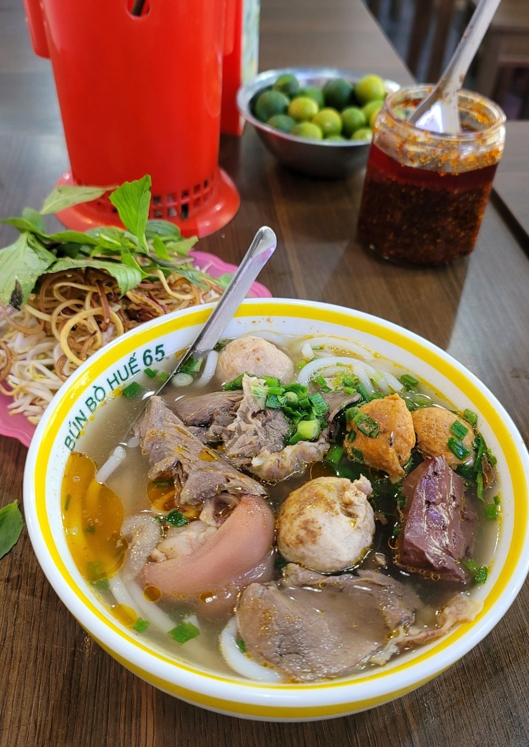 順化牛肉米線算是越南冠上地名,知名的一道平民美食,不只在順化,現在越南各地都可以吃的到,也有連鎖店及很多主打順化牛肉米線的小吃店。牛腩先醃製後和牛骨湯一起燜燉,使得牛肉完全鬆化。其肉湯通常由牛骨、發酵蝦醬、香茅、乾紅辣椒製成。在店內食用時也跟河粉或Bún一樣,店家會附上生菜盤,只不過傳統順化牛肉米粉的生菜盤除了薄荷葉、切碎的蕹菜等,主要生菜一定有生豆芽、檸檬、香蕉花及九層塔等三種固定生菜。另外豬血、豬蹄也是常見,是整晚米線的靈魂配料。我在永安時,晚上或假日中午,常常光顧順化牛肉米線店,45K 越南盾,便宜營養又好吃,簡簡單單就可以解決一餐。
