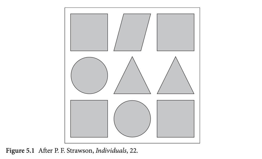图示有助于消除“同一”这一概念的两种意义之歧义。依斯特劳森,当我们说“图中左上角的图形与其右侧有平行四边形、下方有圆的那个图形是同一个”,我们是在谈论数值(numerical)上同一的对象。而如果我们说“图中左上角的图形与右下角的那个是同一个”,我们说的是两个仅在性质(qualitative)上同一的对象。60 性质同一意味着我们所谈的是同一类型或共相(即每个记号(token)或特定的个体都具备该性质);数量同一意味着我们所谈的是一个、可被再识别的相同记号或个体。在空间世界中,我们可以因为“位置”在再识别数上不同的个体中的作用,而轻易地区分这两类同一。