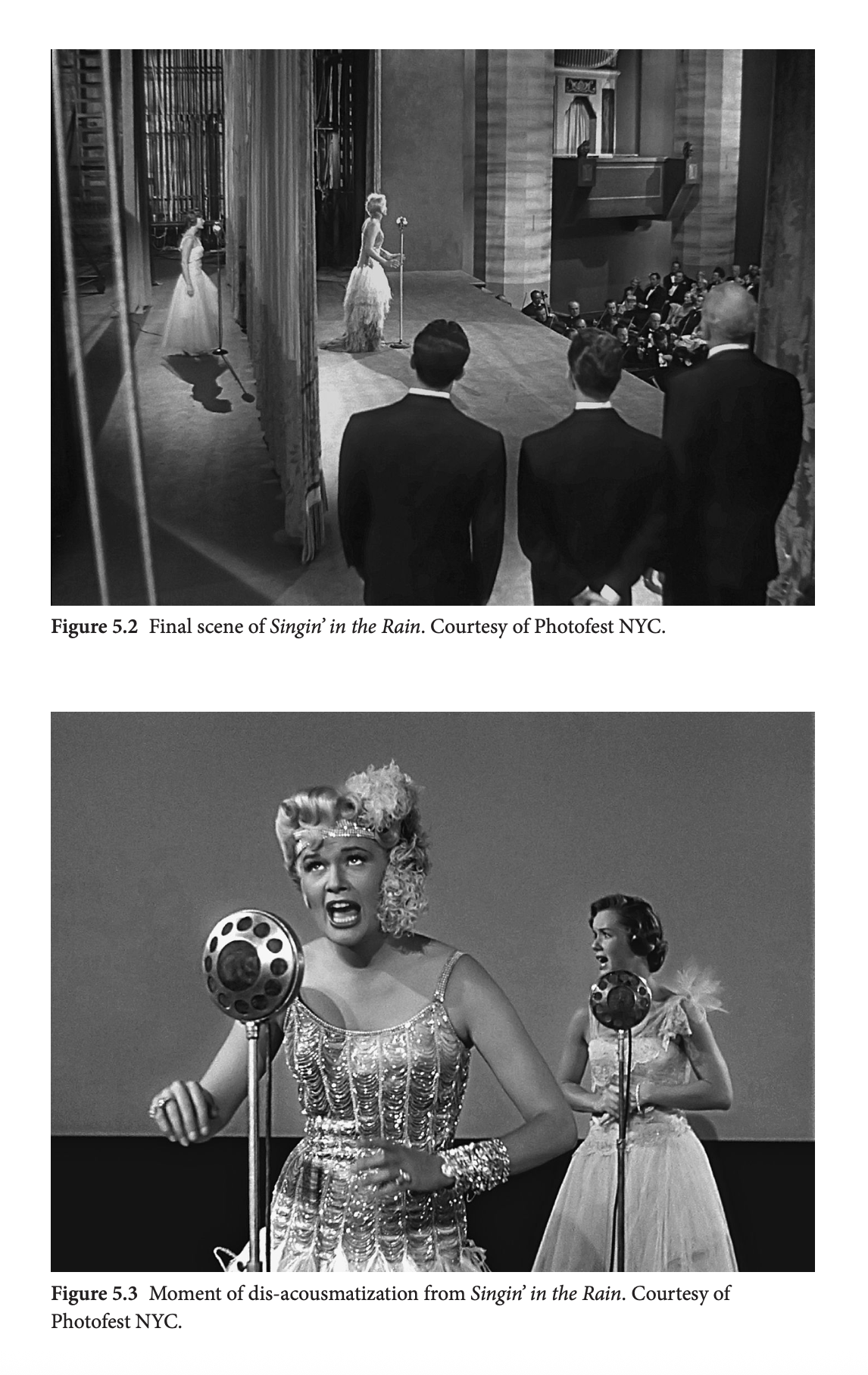 然而,《雨中曲》终场“去幻听化”的安全感很容易被动摇。雷诺兹的嗓音仅仅在象征层面找到了其“真正的身体”。事实上,更令人不安的事情发生了。在对《雨中曲》的研究中,赫斯(Hess)与达博尔卡(Dabholkar)指出:“黛比·雷诺兹的嗓音天然且几乎未经训练,十分适合简单、轻快的歌曲,但在其他方面并不那么称手。”100 《你是我的幸运星》超出了这位年轻明星的把握;与吉恩·凯利最终二重唱的部分,在多次录制后,仍由他人配唱。雷诺兹在《雨中曲》同名曲目中为琼·哈根对口所使用的真实嗓音,并不是她在最终二重唱中从其唇间发出的同一嗓音。后者属于另一位鲜为人知的配音歌者——贝蒂·诺伊斯(Betty Noyes)。101