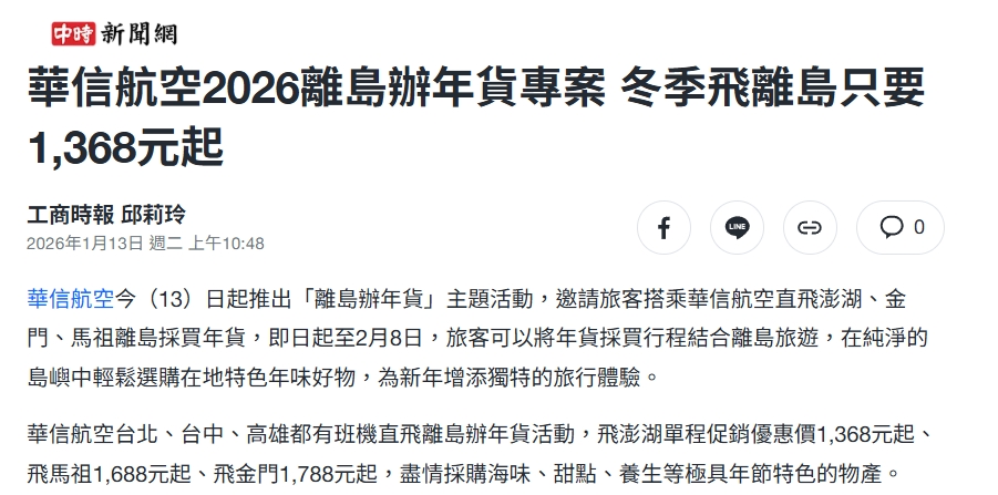 重新用華信航空離島年貨去找新聞,就找到合理又清楚的新聞:
