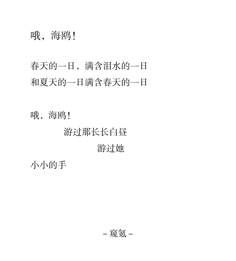 《哦,海鸥!》窥氪chiuenhong·6 小时前(修改过)·IPFS满含泪水的一日 诗歌CC BY-NC-ND 4.0 授权建议频道选择希望推荐到的频道(单选)生活事书音影旅・居性别/爱创作・小说时事・趋势身心灵没有适合的频道不参与频道推荐 (文章将出现在「还有」中)下一步喜欢我的作品吗?别忘了给予支持与赞赏,让我知道在创作的路上有你陪伴,一起延续这份热忱!支持作者支持作者窥氪chiuenhong18岁,马来西亚青年诗人,作品发表于星洲日报、南洋商报,以及新加坡雨林诗刊。 来自作者相关推荐《秋水记》《惴叶》《丢手绢》