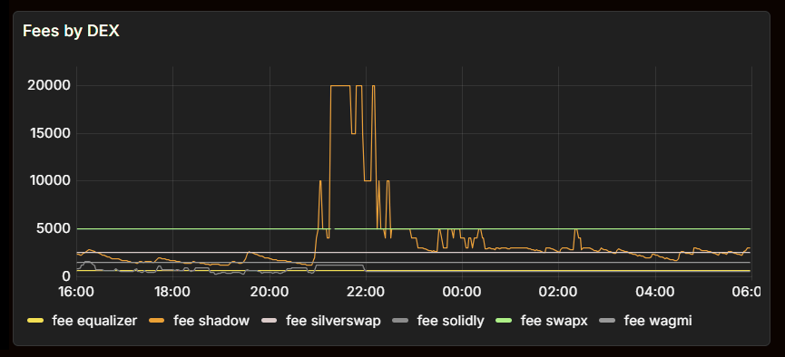 Shadow 的动态费率算法能够实时响应市场变化,有效保护 LP 免受严重无常损失,同时最大化手续费收益。系统一旦识别到潜在的有害流动性,便会主动调高费率以保护资金。同一时段内,Sonic 生态中没有其他交易所做出类似响应。
