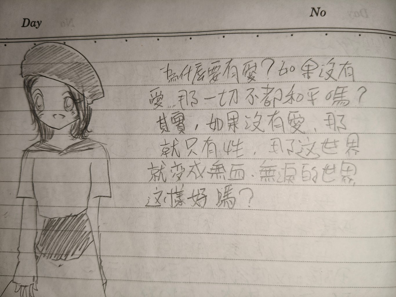 為什麼要有愛?如果沒有愛……那一切不都和平嗎?其實,如果沒有愛,那就只有性,那這世界就變成無血、無淚的世界,這樣好嗎?