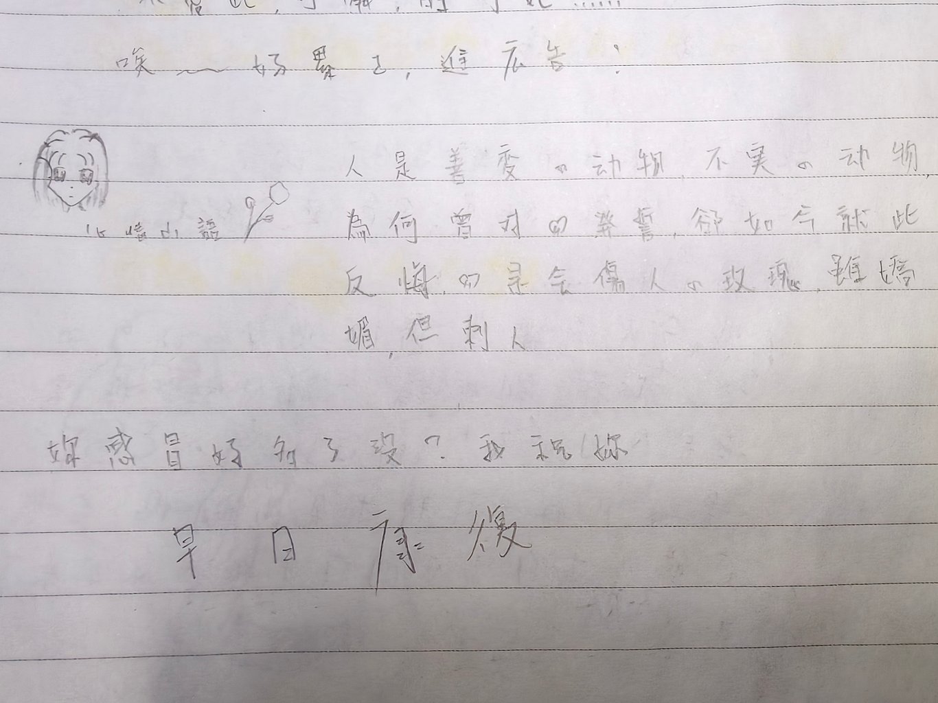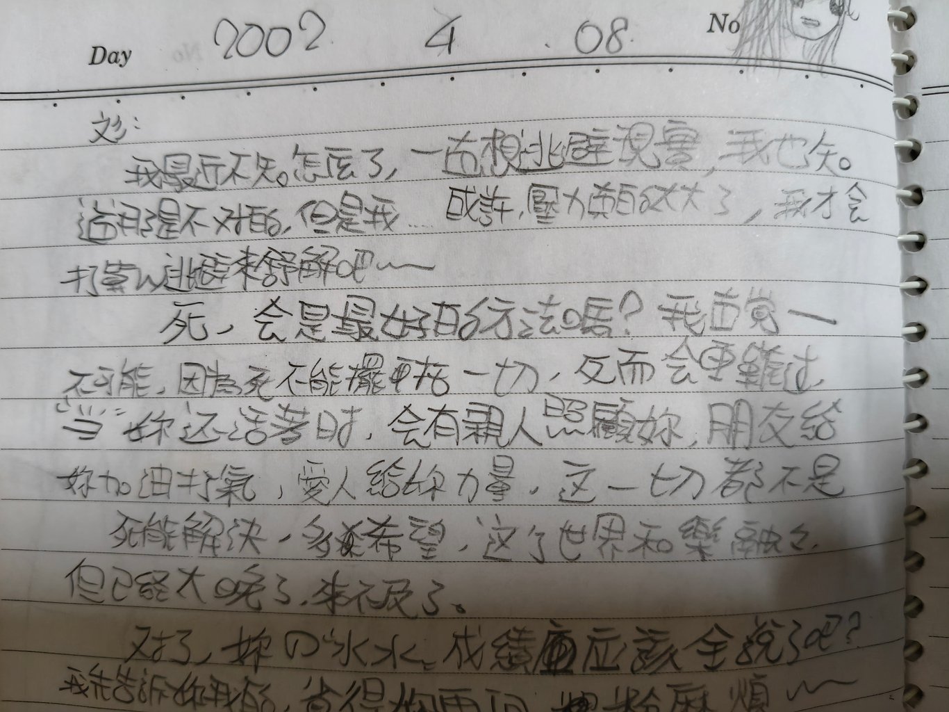 死,會是最好的方法嗎?我直覺——不可能,因為死不能擺脫一切,反而會更難過,當你還活著時,會有親人照顧你,朋友給你加油打氣,愛人給你力量,這一切都不是死能解決,多希望這世界和樂融融,但已經太晚了,來不及了。
