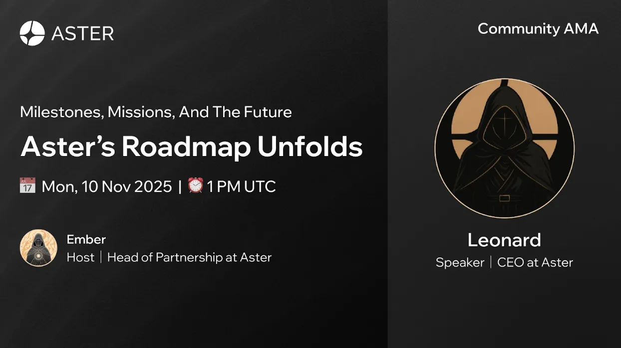从推出 Rocket Launch 为用户提供优质资产的早期参与入口,到推出以隐私为重点的 Layer 1,再到通过质押/回购/销毁/费用折扣等一系列设计赋能 $ASTER 代币… 2025 年 11 月 10 日,Aster 创始人 Leonard 通过一场直面社区的 AMA 活动给出清晰回答: