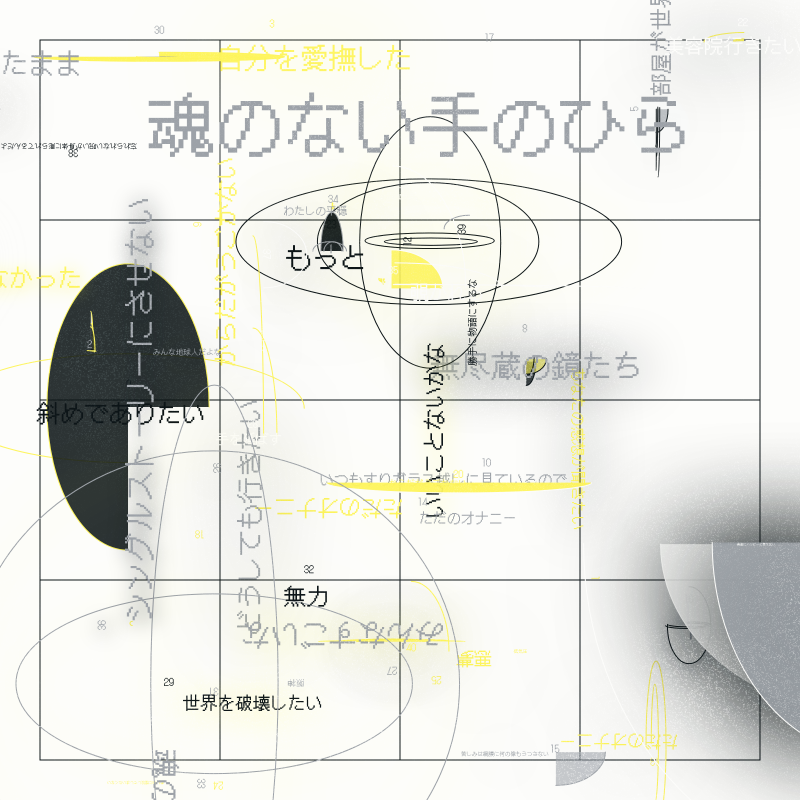 一開始會被這幅作品吸引的原因是因為在一眾以英文創作的作品中,佈滿日文字的作品顯得十分搶眼,點進作品介紹才發現作者過去飽受心理疾病所苦,於是決定以自己最熟悉的語言記錄下私密且赤裸真實的自己。雖然整體以向量線條、方塊與點陣文字呈現,卻散發出一種病態的柔軟,像是努力在系統錯誤中掙扎求生的靈魂一樣,十分觸動人心。