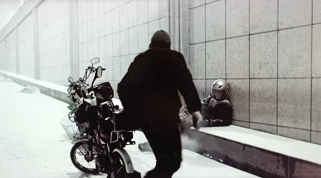其二是張自力1999年出院後,見到吳志貞把梁志軍的骨灰灑在洗衣店門口的行道樹下,之後立刻切到飄雪的夜晚,地下道旁坐倒一人,面前停著輛機車,此處同樣是個主觀鏡頭,原來是個騎機器腳踏車的路過之人,見機車騎士倒坐路邊,上前探問,起初還以為是個好心人,哪知待確認機車騎士起不了身之後,立馬丟下自己那台爛機器腳踏車,把較昂貴的機車給騎走了去!