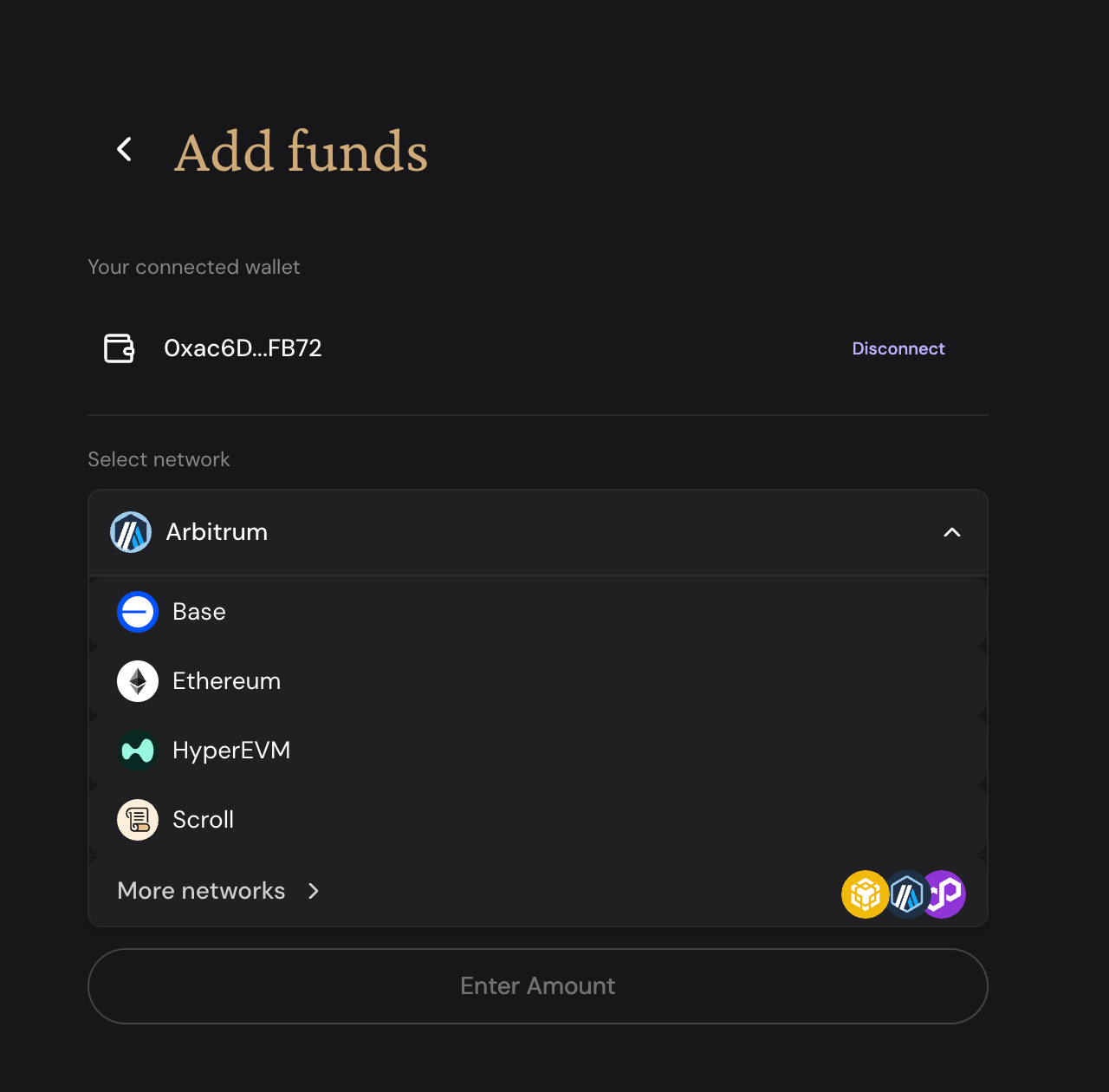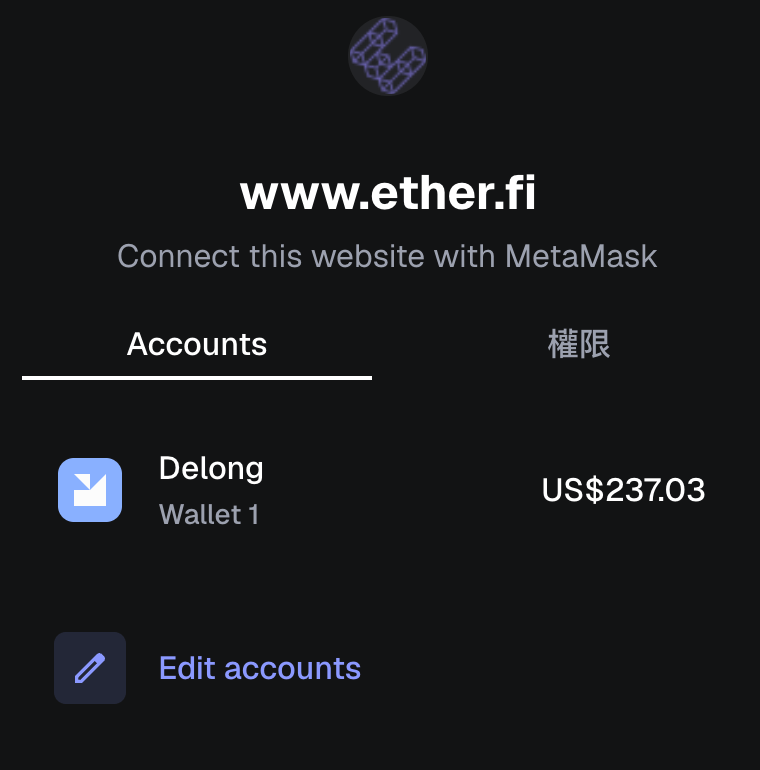 進入 ether.fi 後,找到 Vault 分頁,點 Add Funds,接著你應該會看到自己的錢包地址出現在選項裡。如果沒有,大概就是剛才說的帳號問題。