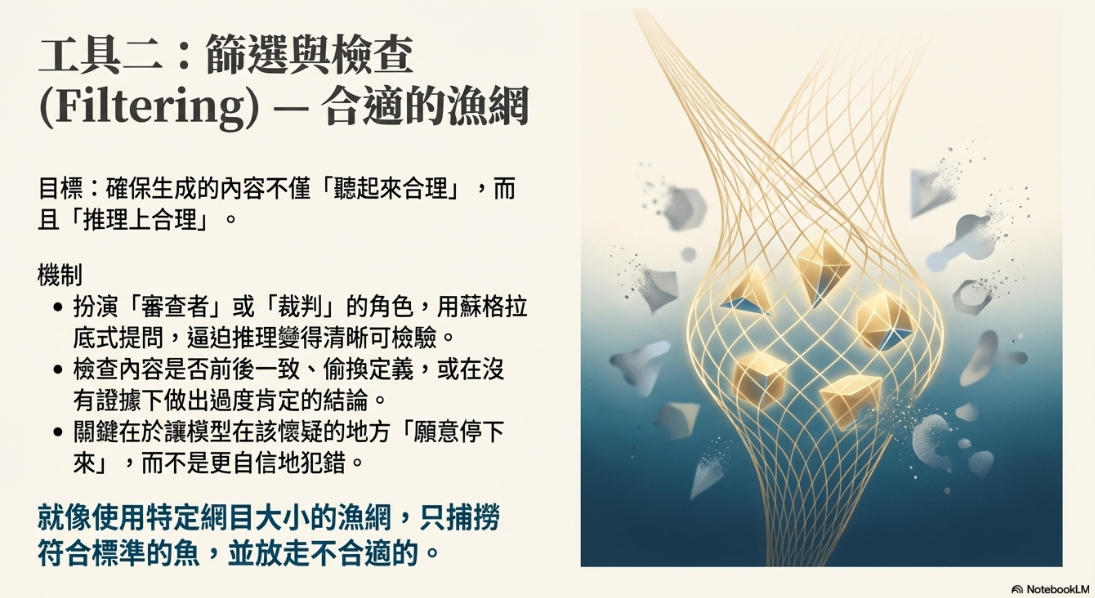 即使目標已經綁定,語言模型仍然可能產生看似合理、實際卻有問題的內容。因此,協調層的第二個功能,是篩選與檢查。這一層的重點,不在於「回答漂不漂亮」,而在於「推理合不合理」。它會檢查生成的內容是否前後一致,有沒有偷換定義,有沒有用模糊語言掩蓋關鍵問題,或是在沒有證據的情況下做出過度肯定的結論。
