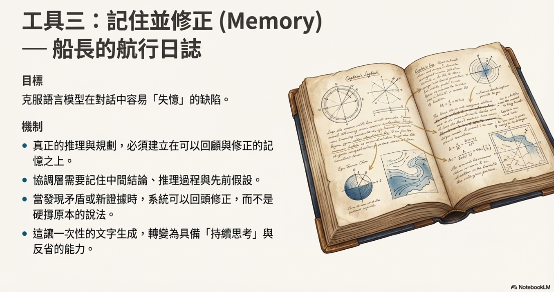 協調層的第三個關鍵功能,是記憶與持續性。一般的語言模型,在每一輪對話中其實都很容易「失憶」:前面說過什麼、犯過什麼錯、做過什麼承諾,常常無法被可靠地保存與追蹤。作者認為,真正的推理與規劃,必須建立在可以回顧與修正的記憶之上。
